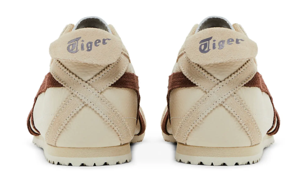 This version of the Onitsuka Tiger Mexico 66 is made with a white leather upper. Beige suede overlays adorn the toe cap and form an X at the heel. Burgundy tiger stripes that have become synonymous with the brand run across the midsoles. The Onitsuka Tiger logo appears on the thin white tongue in burgundy and the word 'Tiger' on the leather white heel tab, also in burgundy. A thin, flat, rubber outsole completes the streamlined look.