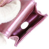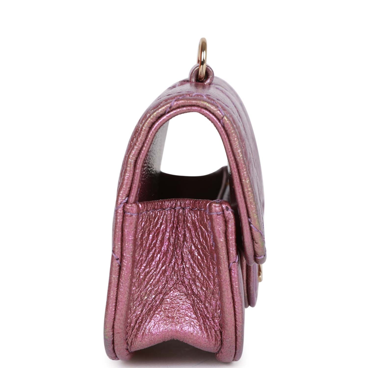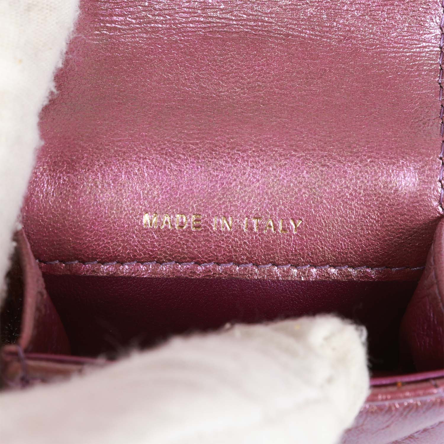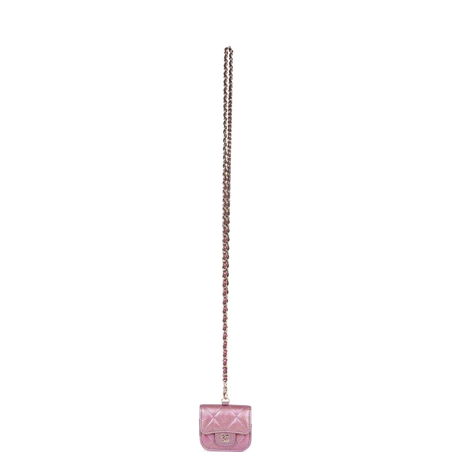 This AirPods Pro case bag is of purple iridescent lambskin leather with light gold tone hardware and has a front flap with signature CC snal closure and a single interwoven purple leather and light gold tone chain link shoulder/crossbody strap.