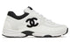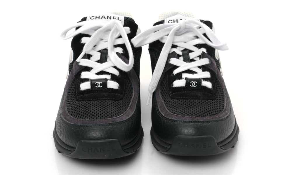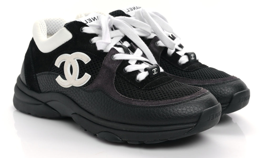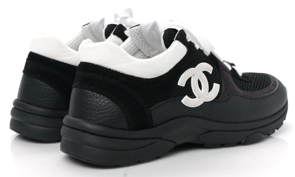 This is an authentic pair of CHANEL Mesh Suede Grained Calfskin Womens CC Sneakers in Black and White. These stylish sneakers are crafted of black leather, suede leather, and mesh fabric with a white CHANEL CC logo on one side.
