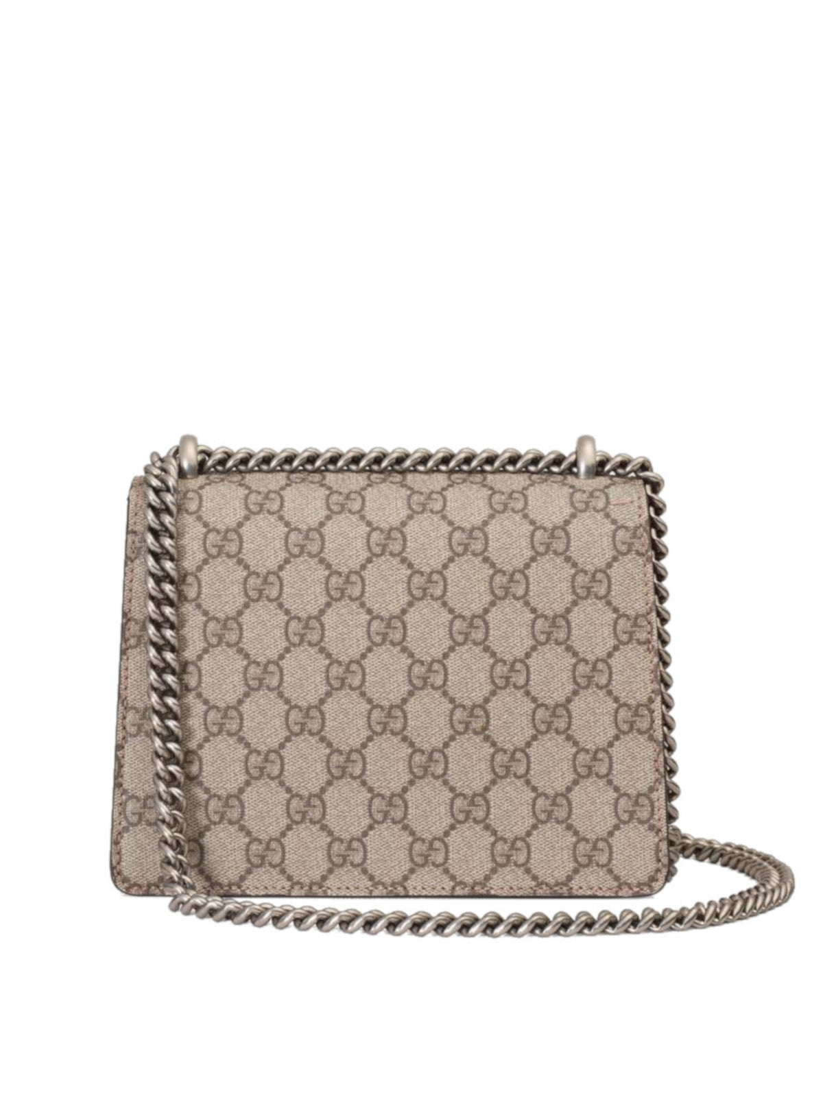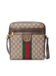 Tela GG supreme con dettaglio di camoscio a contrasto, tracolla in catena, fibbia caratteristica e tasca sotto la patta.
