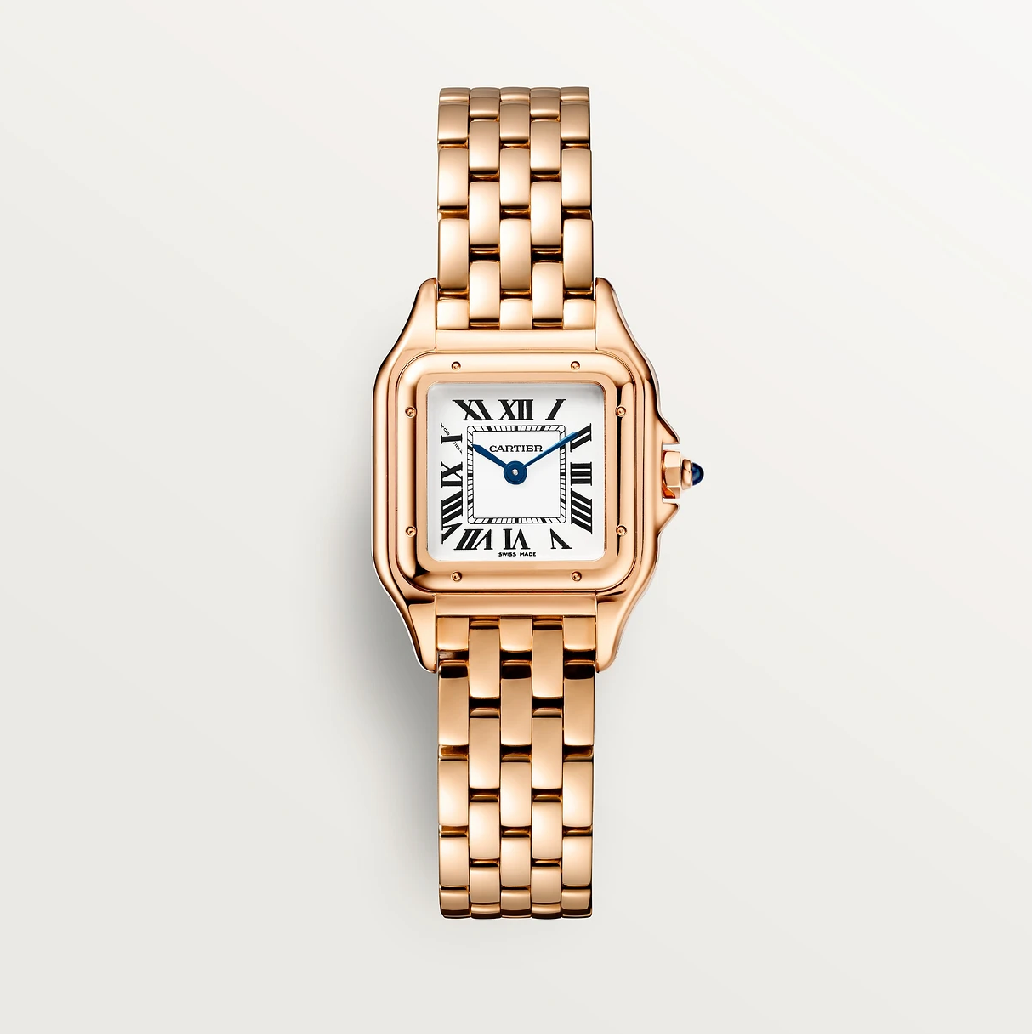 A refined expression of Cartier's classic design, this small Panthère model pairs a warm rose gold bracelet with a brilliant silver dial and iconic sapphire crown detail.