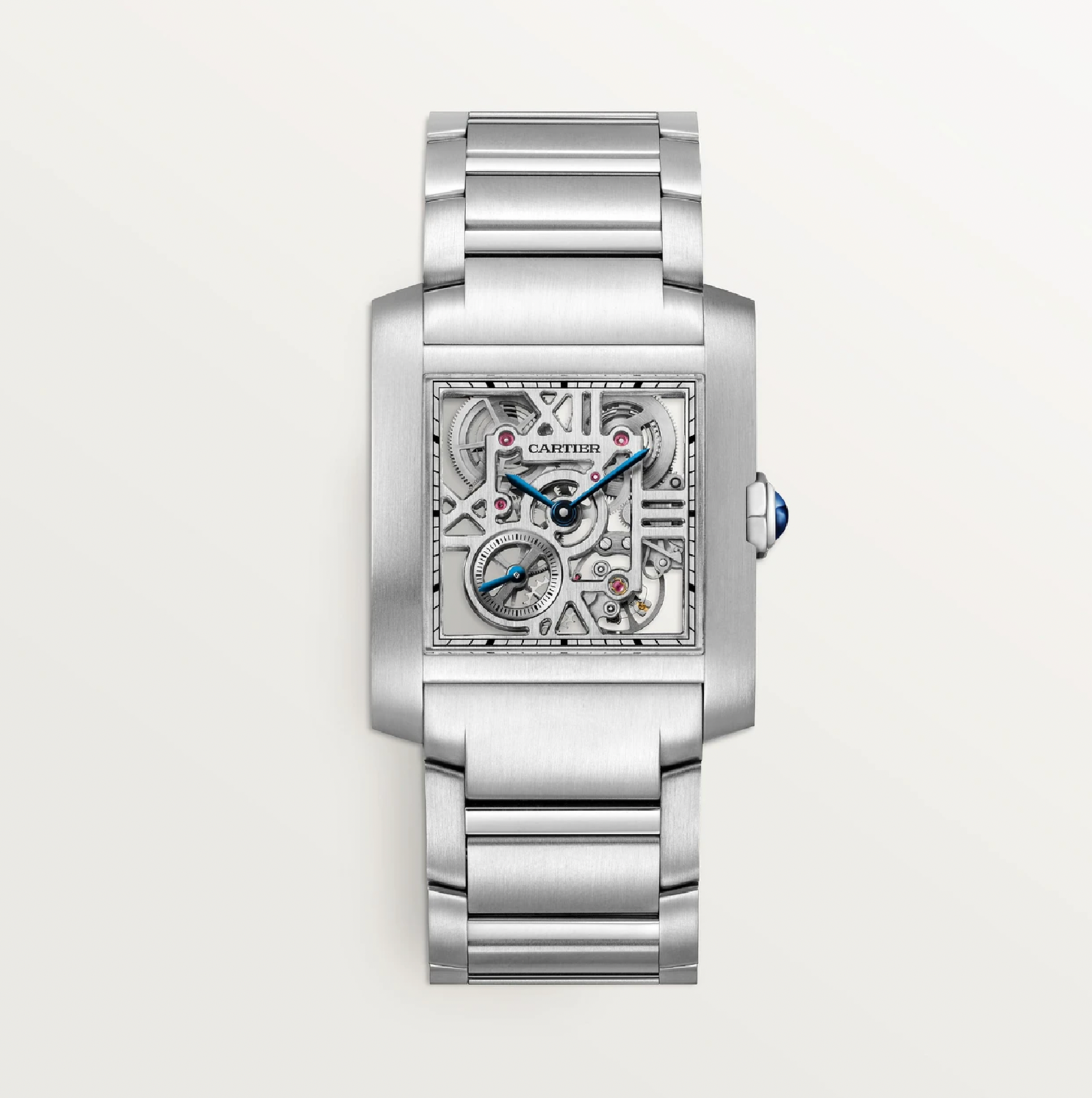 The Skelettierte Tank Française in stainless steel demonstrates Cartier’s modern approach to skeletonized architecture, showcasing the hand-wound 9630 MC caliber in a sharp open-worked form with full steel construction and sapphire detailing. |