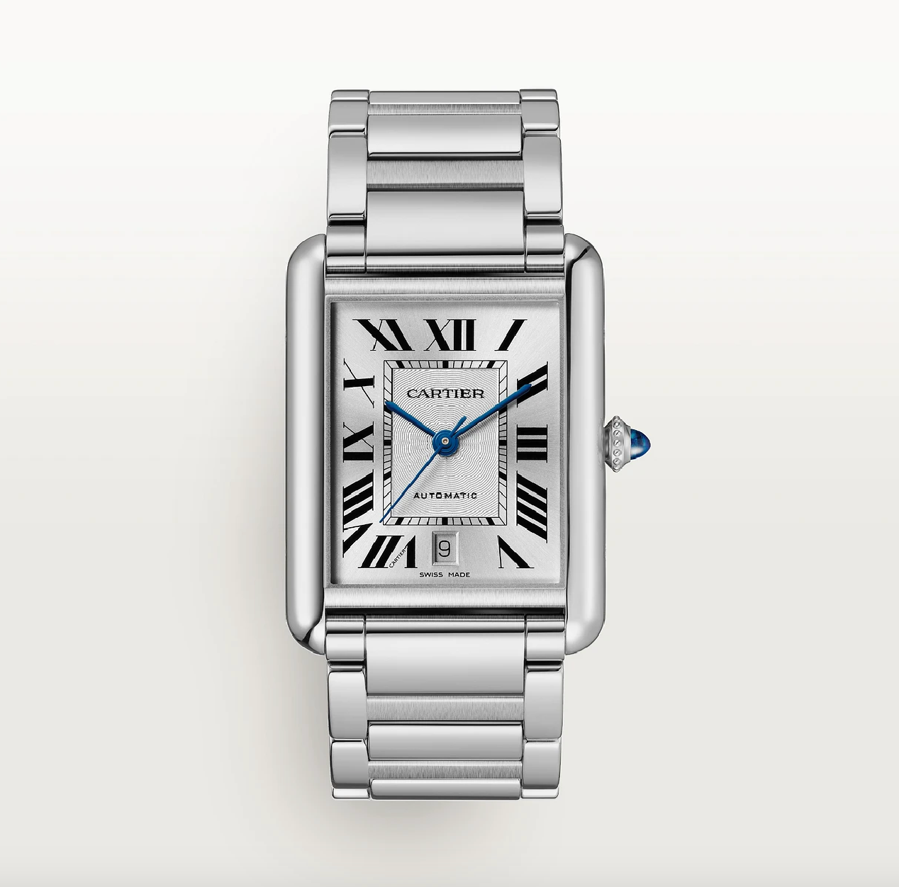The Tank Must XL Automatic combines Cartier's iconic Tank design with modern automatic mechanics, featuring an elegant flinqué silver dial and durable stainless steel bracelet for timeless everyday sophistication. |