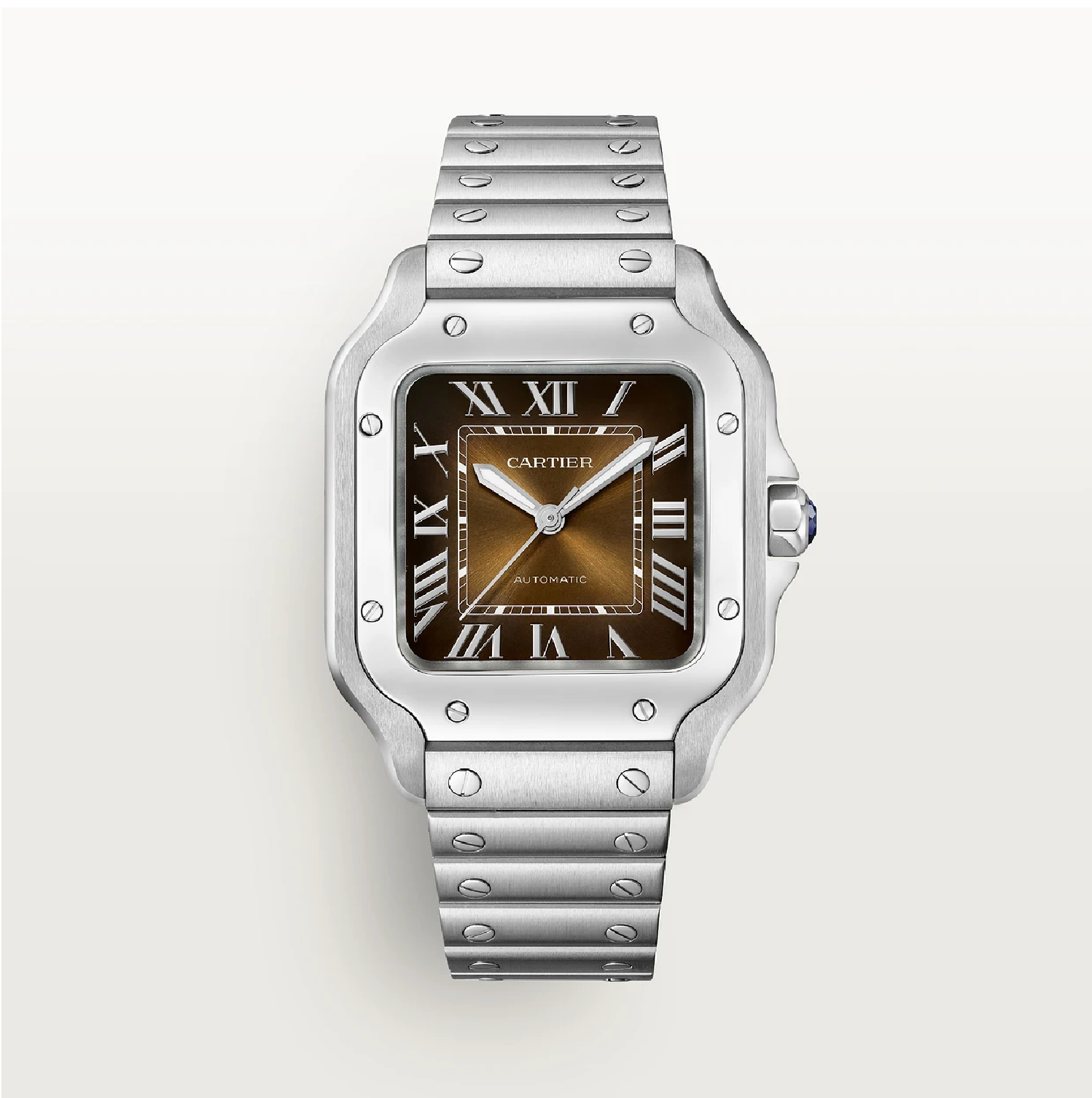 Elegant medium-sized Santos de Cartier with automatic 1847 MC movement, SmartLink adjustment, and QuickSwitch system for easy strap changes.