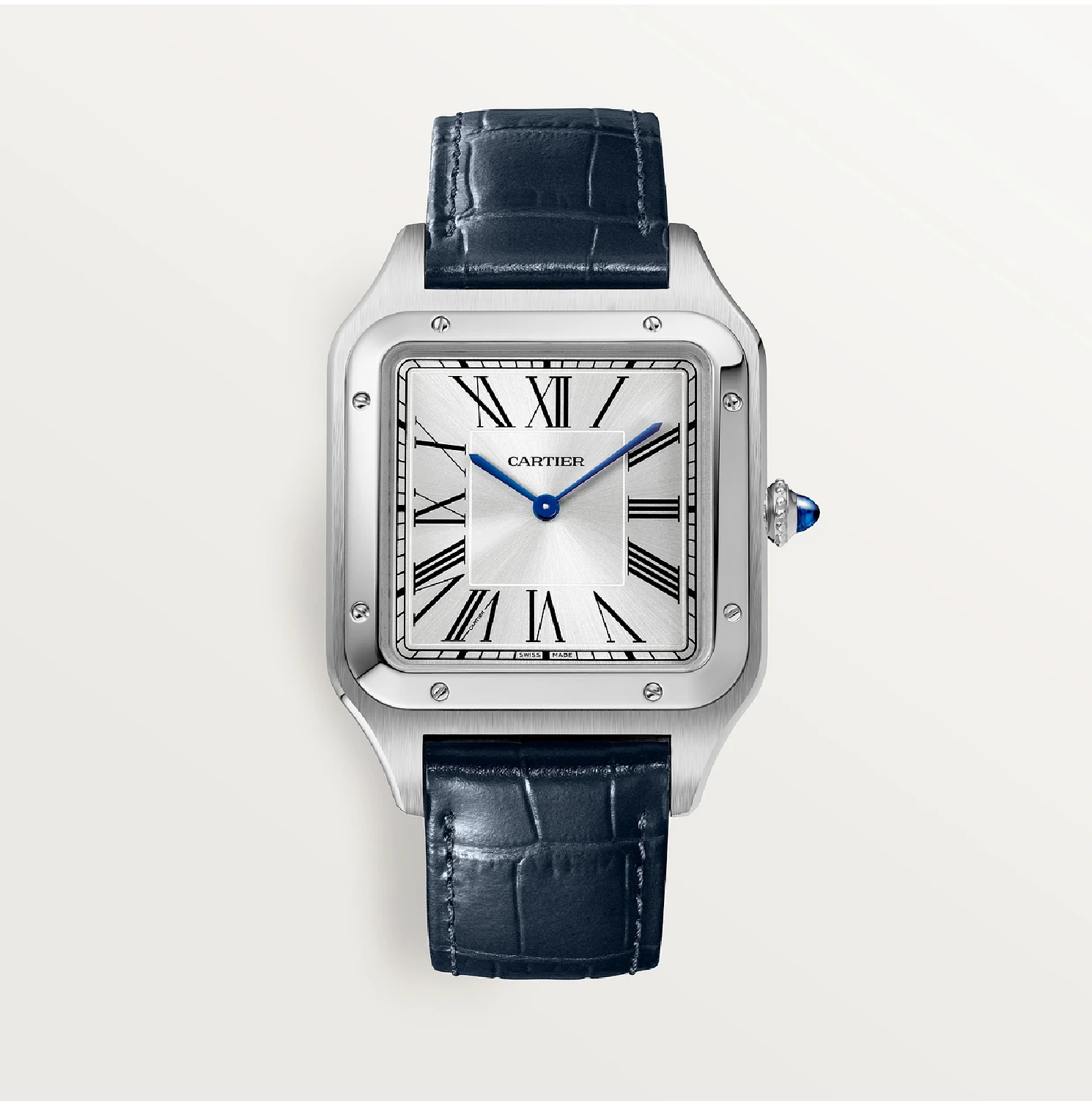 The Cartier Santos-Dumont Extra-Large features a hand-wound Manufacture caliber 430 MC, refined steel construction, and elegant navy blue alligator strap for a classic touch. |