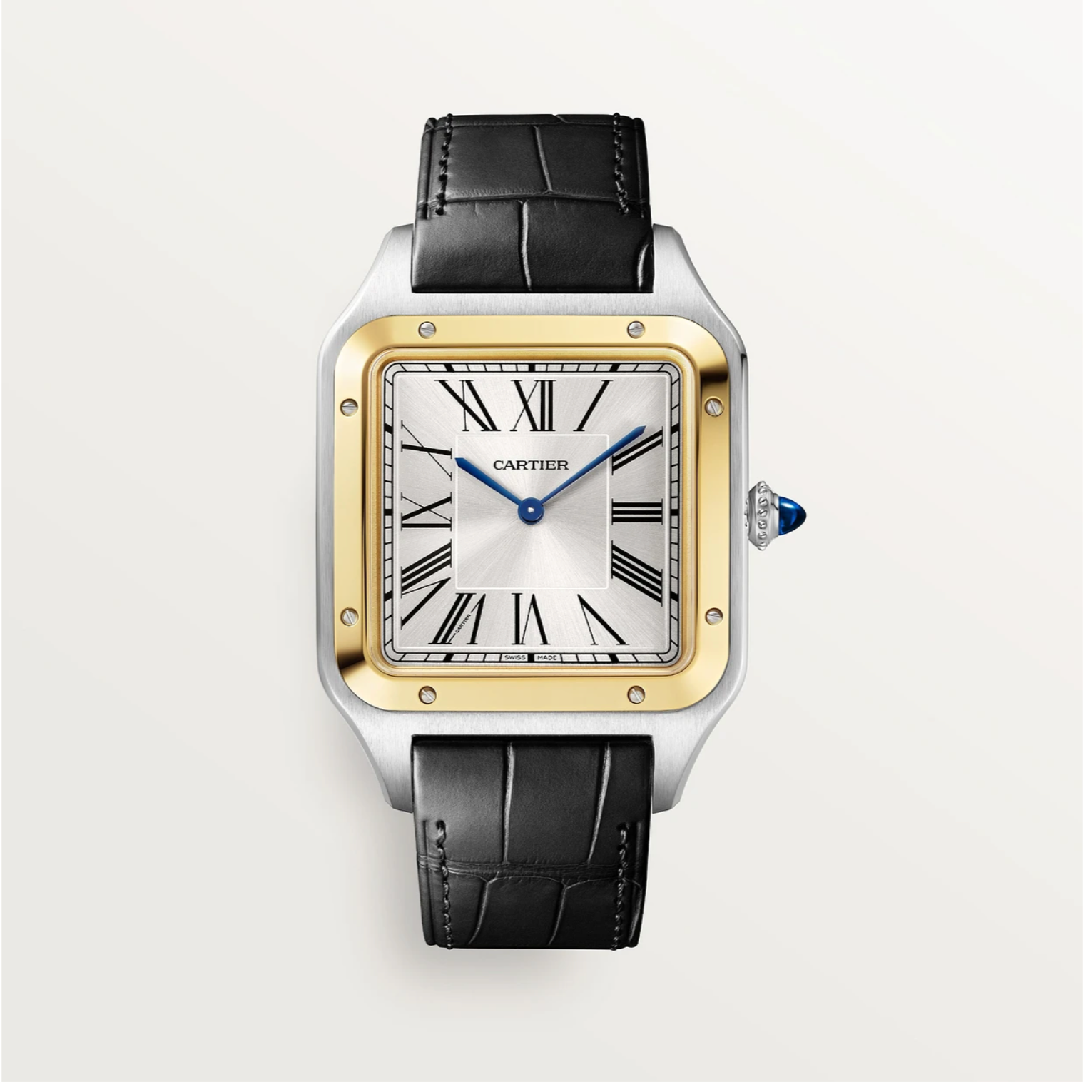 The Santos-Dumont watch XL by Cartier features a refined blend of steel and yellow gold, a manufacture caliber 430 MC manual movement, and elegant design details including a sunray dial, Roman numerals, alligator strap, and sapphire crystal.