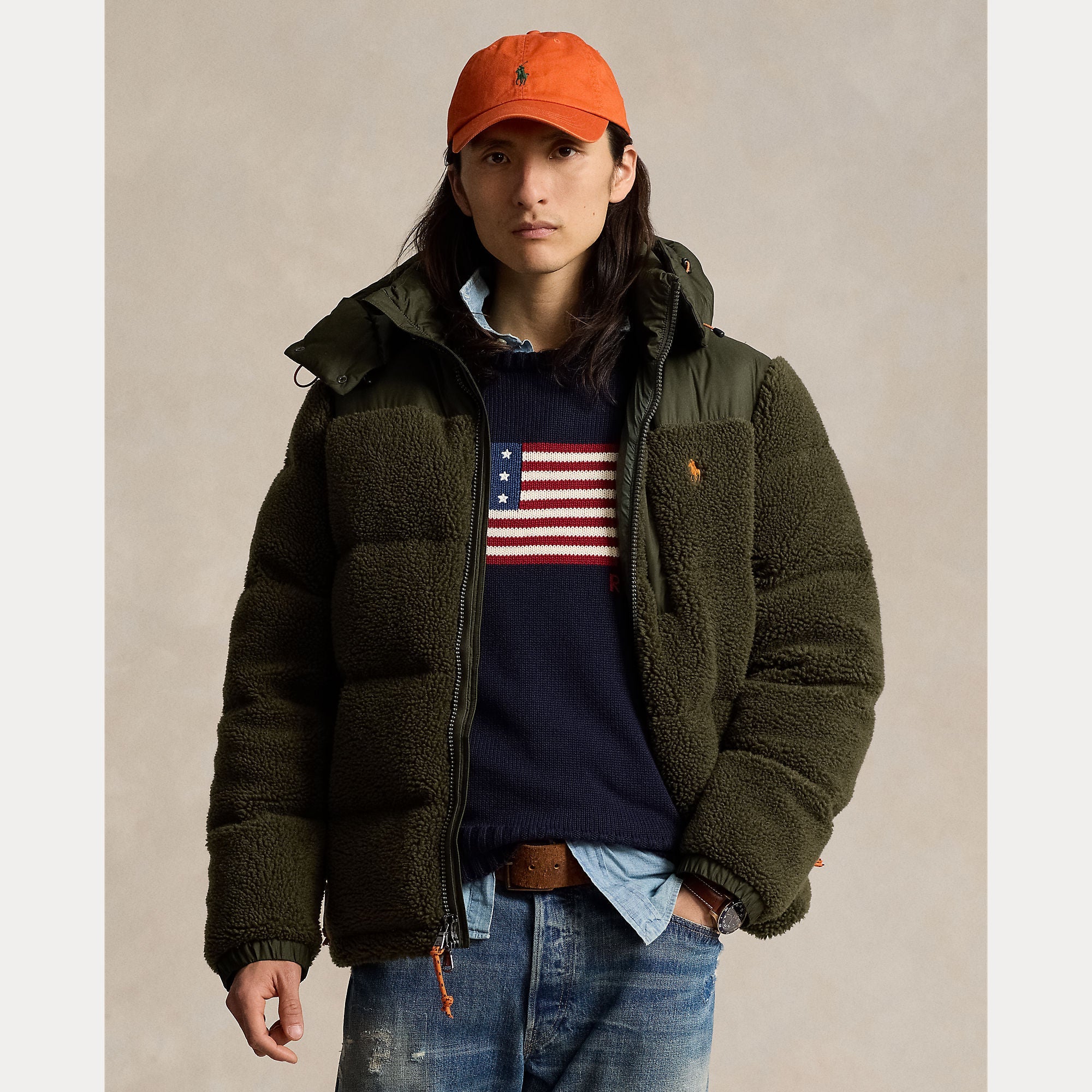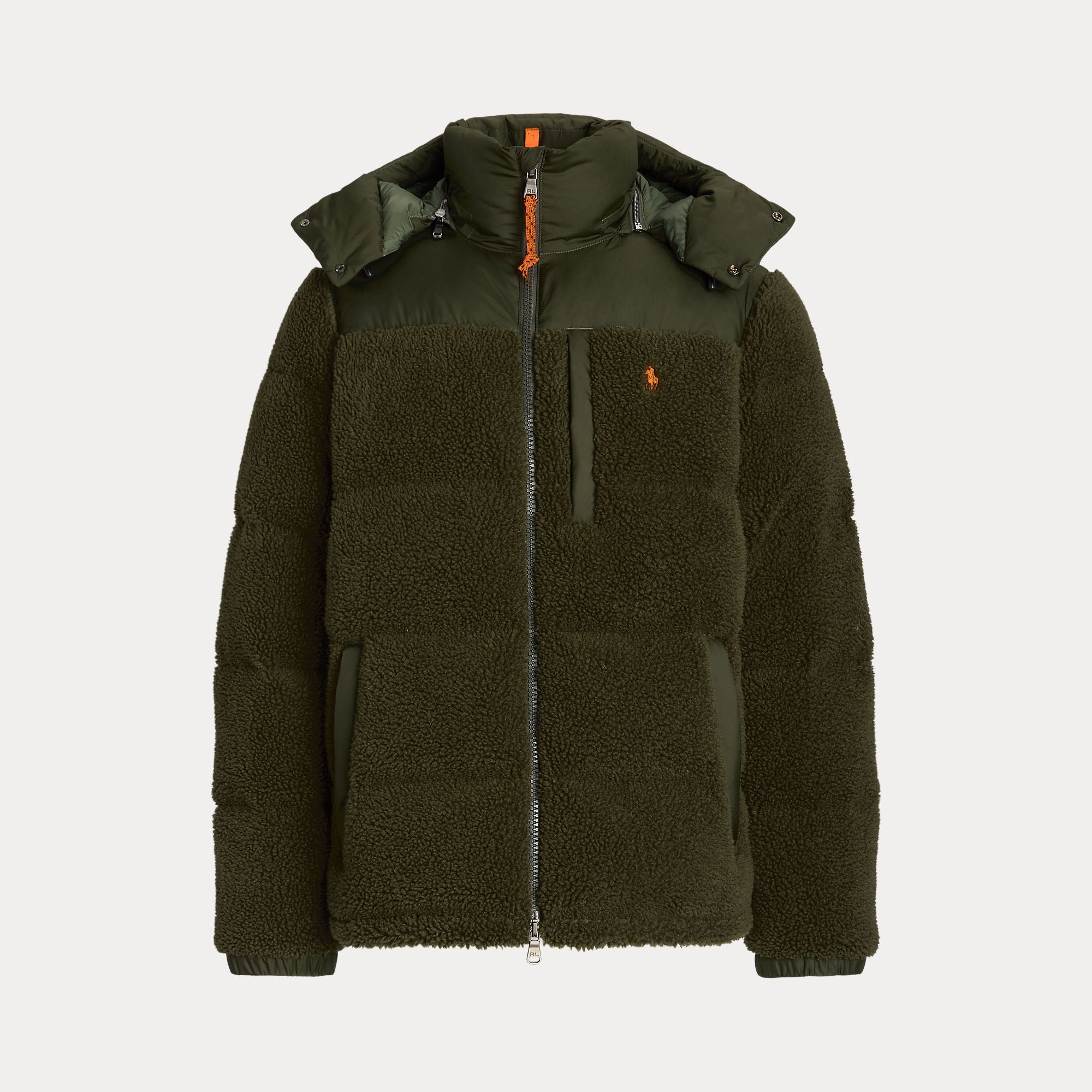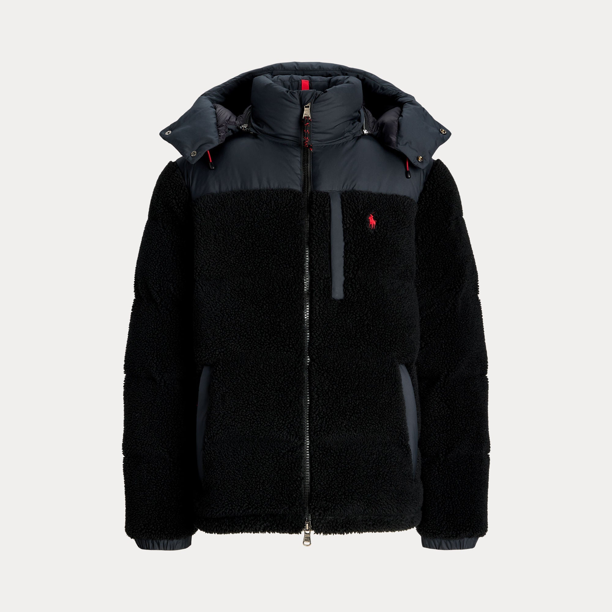 This jacket combines cozy high-pile fleece with sleek ripstop fabric for a modern take on texture. It is insulated with 650-fill-power down and constructed with a detachable hood for extra protection from the elements.