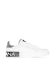 Tomaia in vitello, tallonetta in vitello a contrasto con logo in gomma a microiniezione, lacci piatti, fussbett in vitello con etichetta logata, suola in gomma con spoiler in cuoio e logo a macroiniezione.