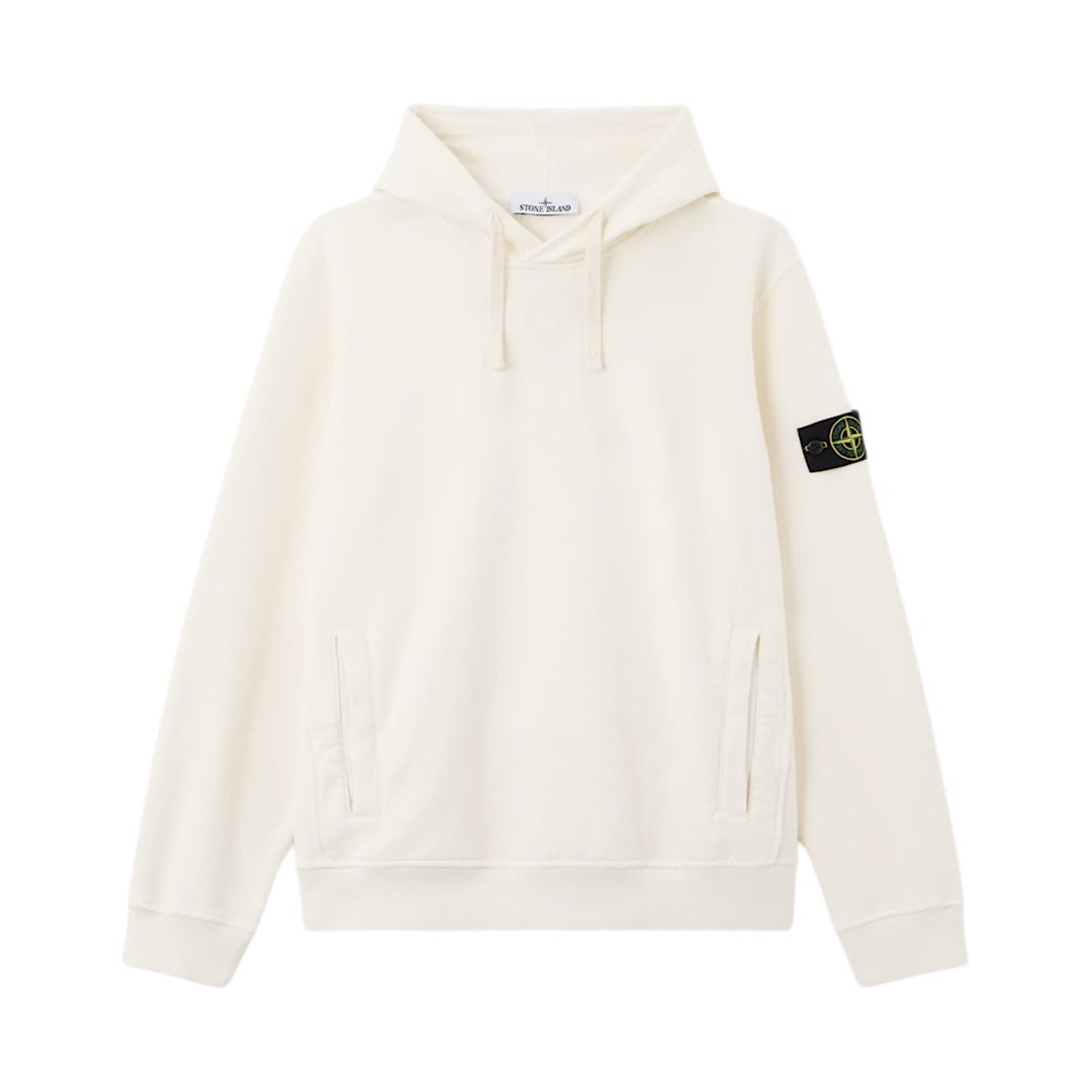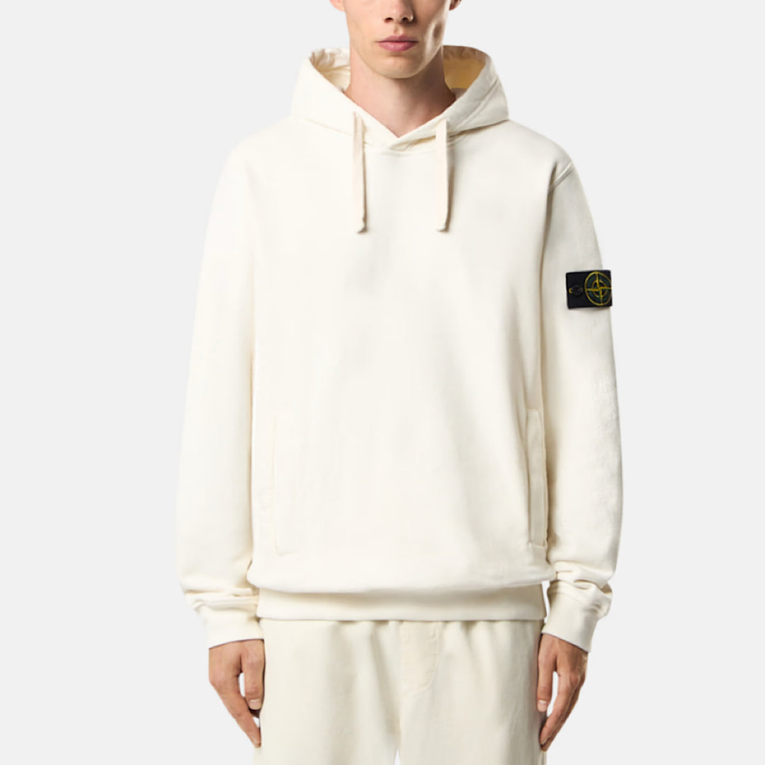 Felpa in cotone biologico garzato con tasca a marsupio con bordo a costine, cappuccio foderato in jersey e fasce laterali a costine. Modello tinto in capo.