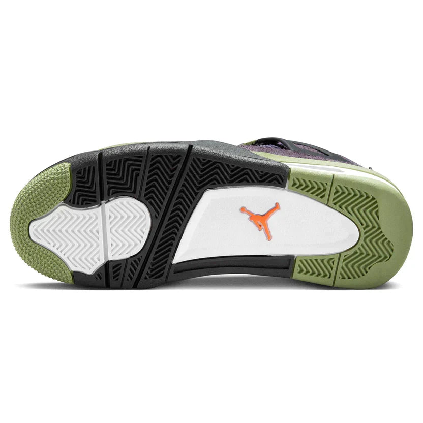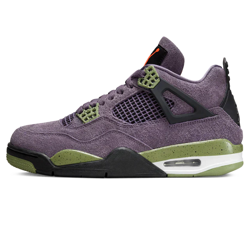 'The Women's Air Jordan 4 Retro 'Canyon Purple' offers Tinker Hatfield's 1989 design with a complete makeover.' Replacing the shoe's traditional leather or nubuck construction, the upper is constructed from matted suede in a vibrant purple finish. Lime Green accents land on the speckled eyestays and midsole, while a Signature Jumpman logo graces the woven tongue tag in Safety Orange. The bright hues are offset by contrasting hits of Black on the molded wings, Jumpman-embossed heel tab and herringbone rubber outsole.