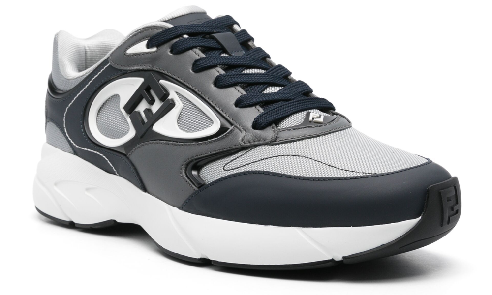 Fendi Forward lace-up sneakers. Made of gray tech mesh with blue and gray leather inserts. Dark blue rubber side injection molding with 3D-effect FF logo. Lightweight rubber running sole with embossed FF on the toe.