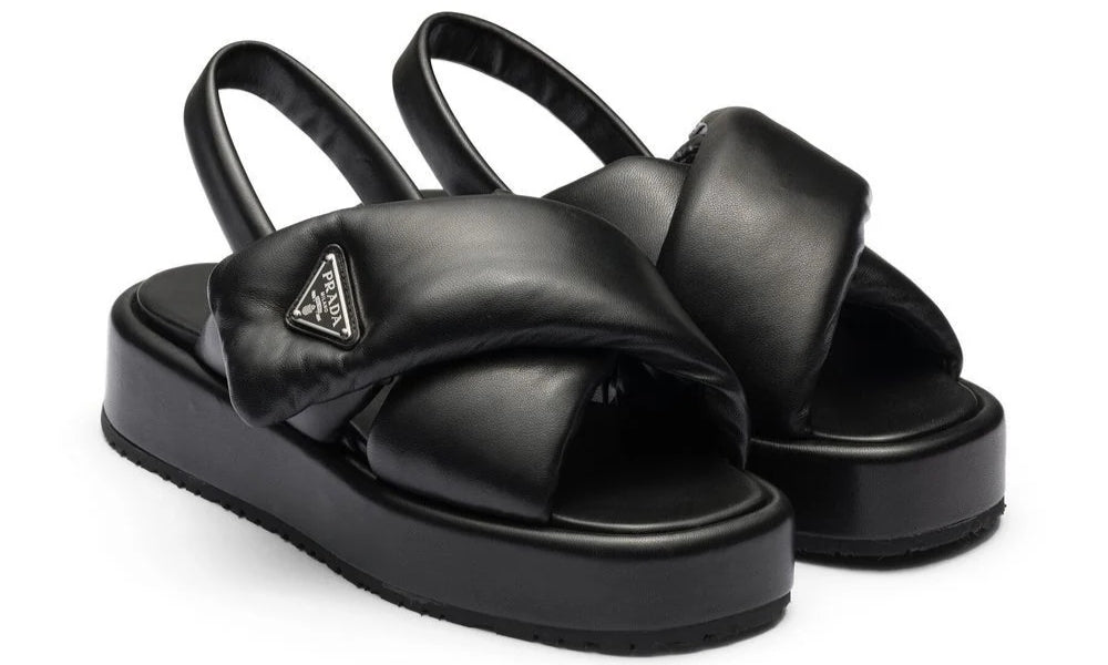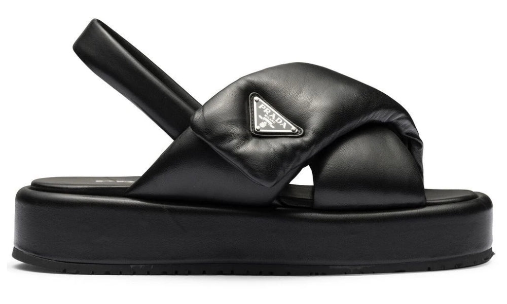 The Prada Soft Sandal is a new expression of craftsmanship and innovation, with soft lines and a sophisticated design. These sandals are made using nappa leather (sheep leather) and have a design that does not lose its shape using outstanding manufacturing technology. Featuring a metal triangle logo.
