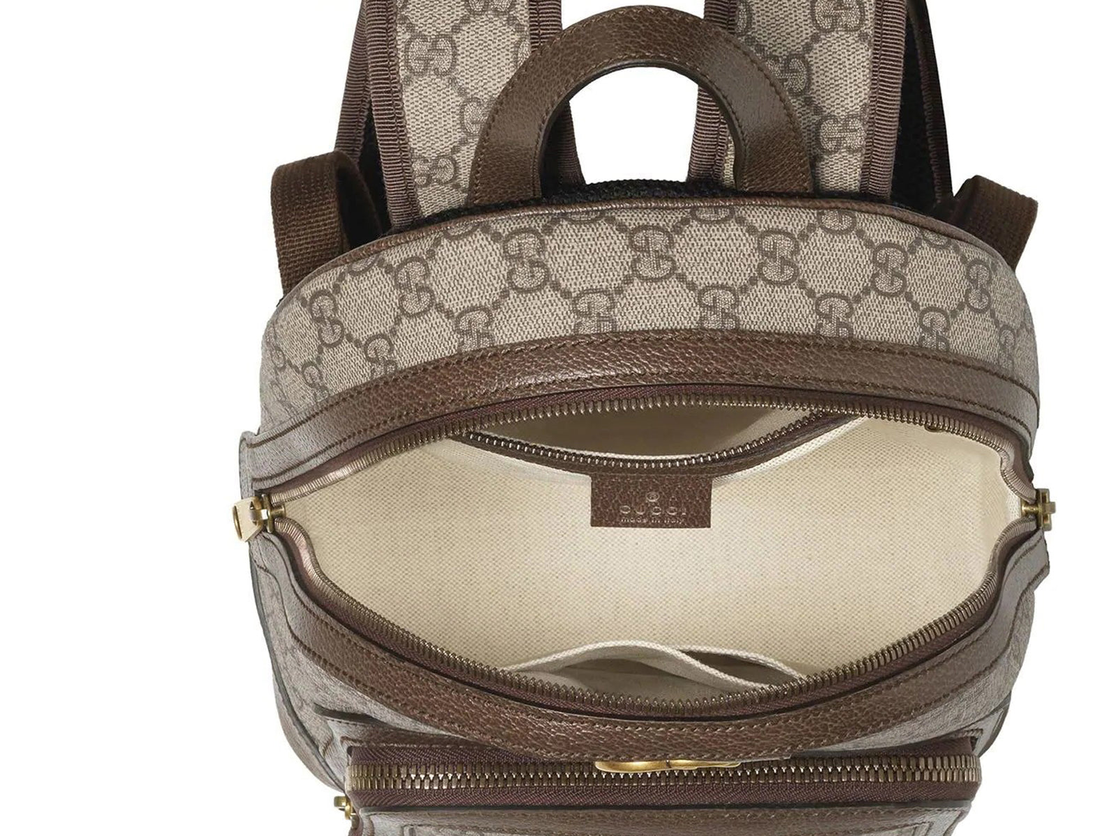 Signature monogram pattern and brand stripes; central zip pocket; interior zip and smartphone pocket; adjustable straps.