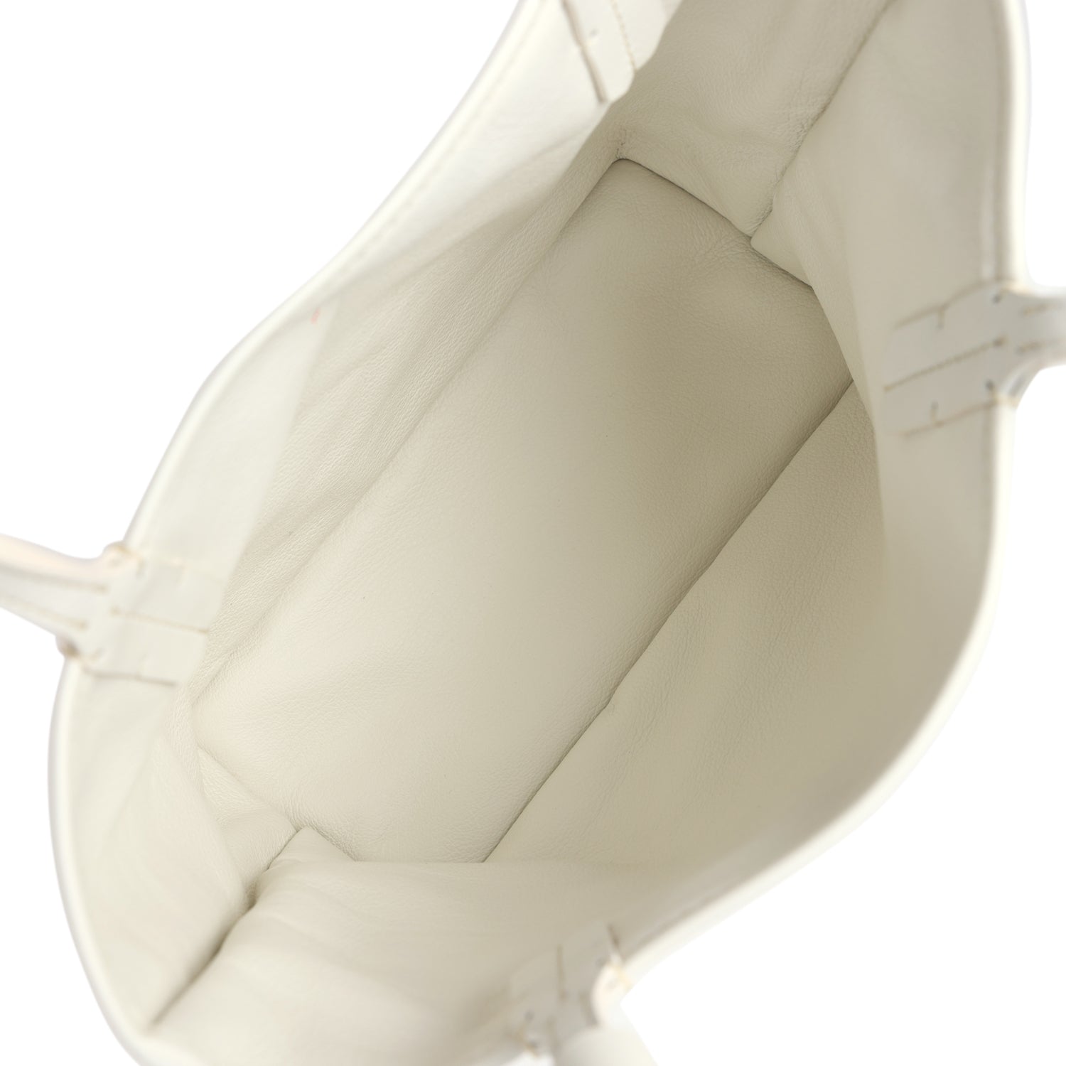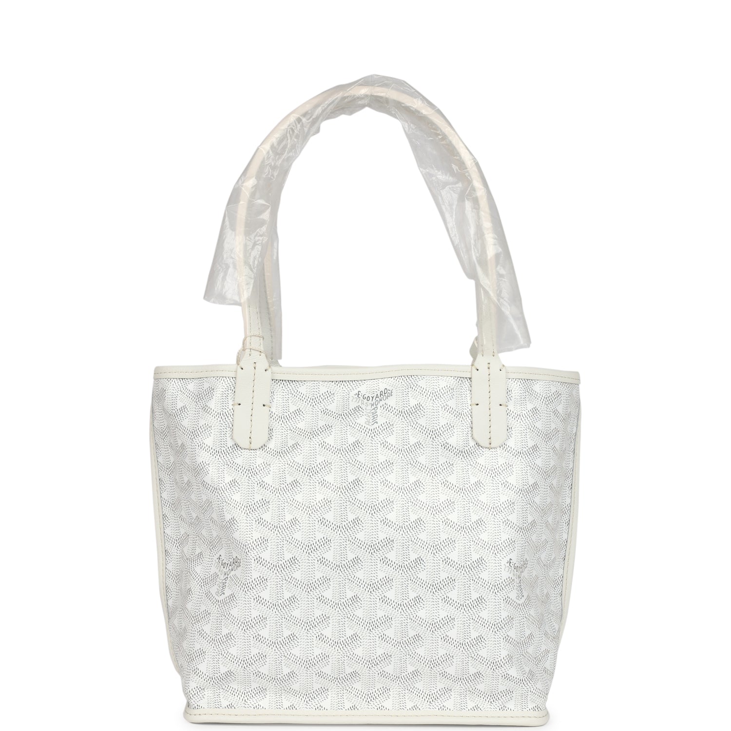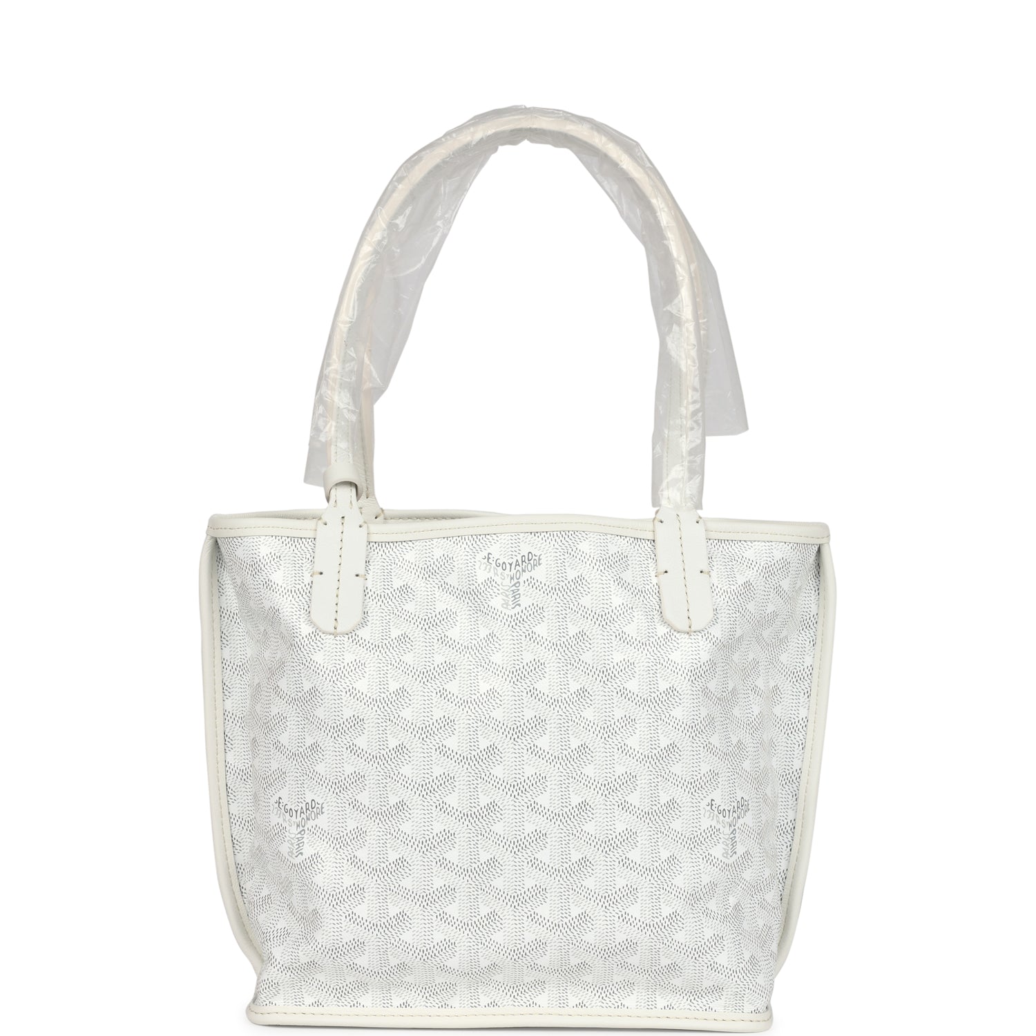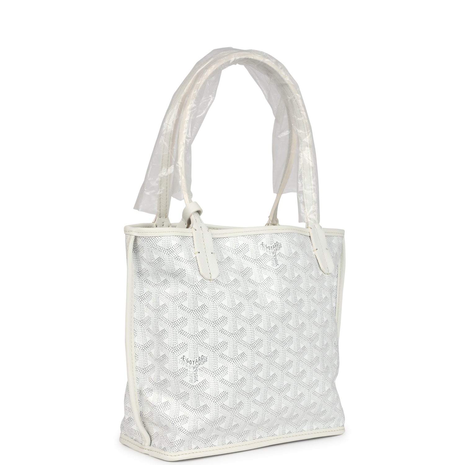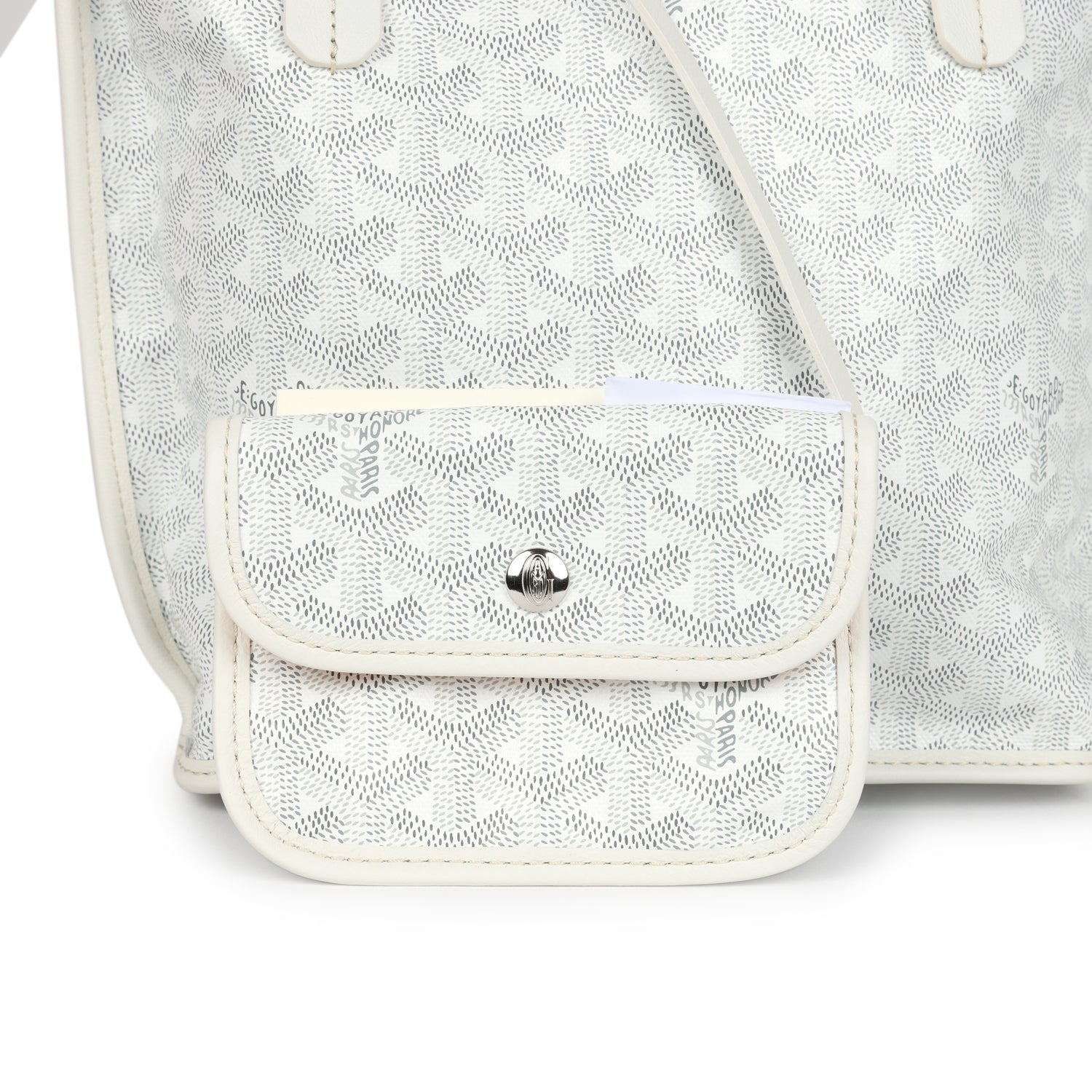 This Anjou Mini reversible tote is of white Goyardine canvas and leather with palladium hardware and features white leather handles and trim, removable pouch and white stitching.