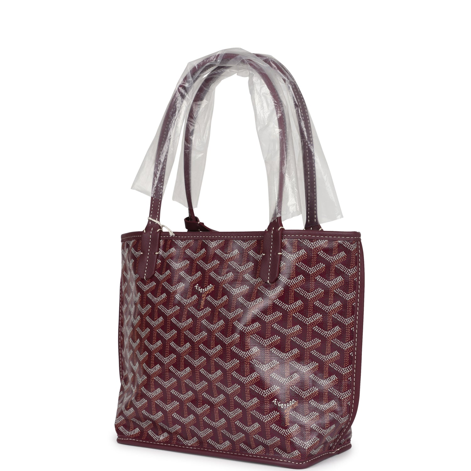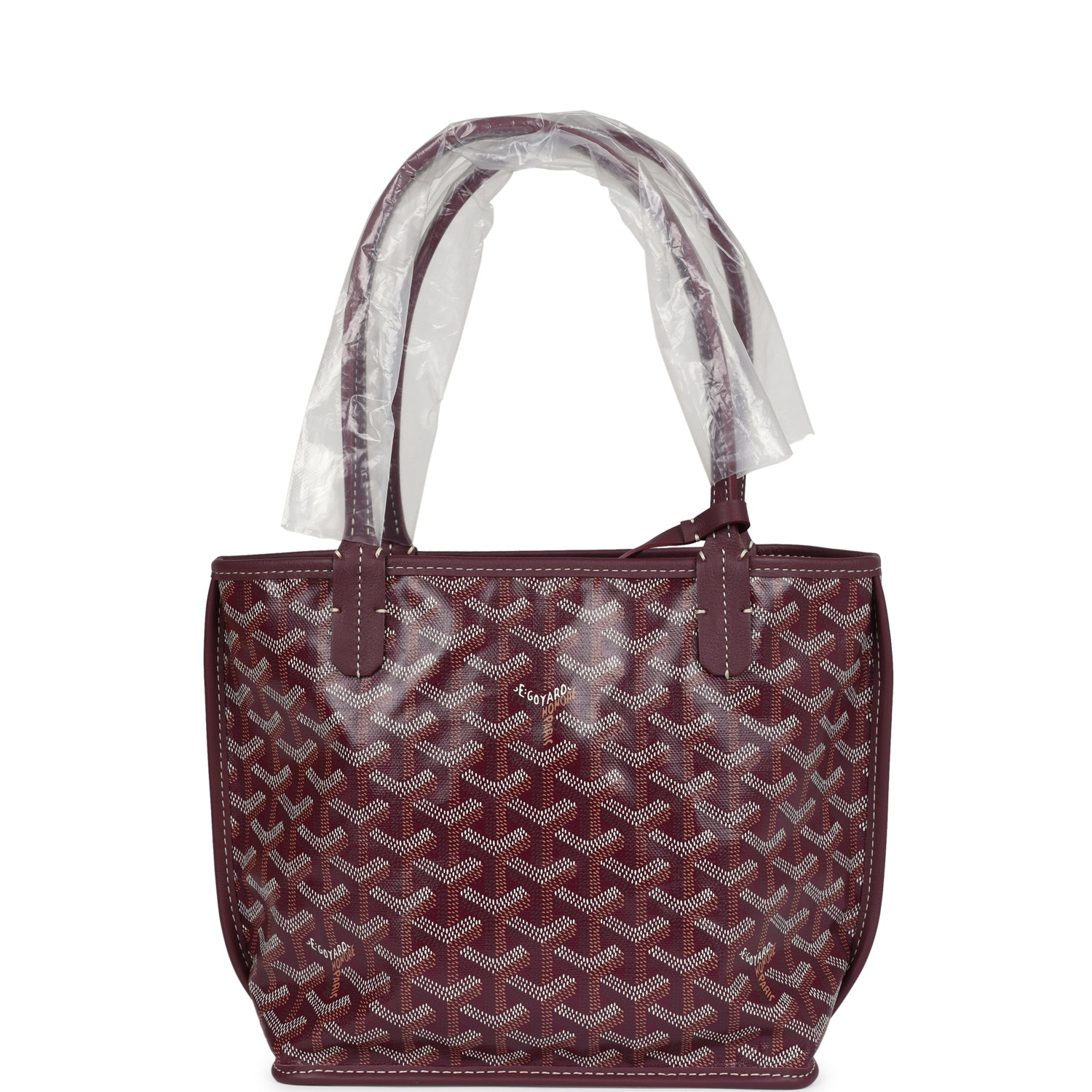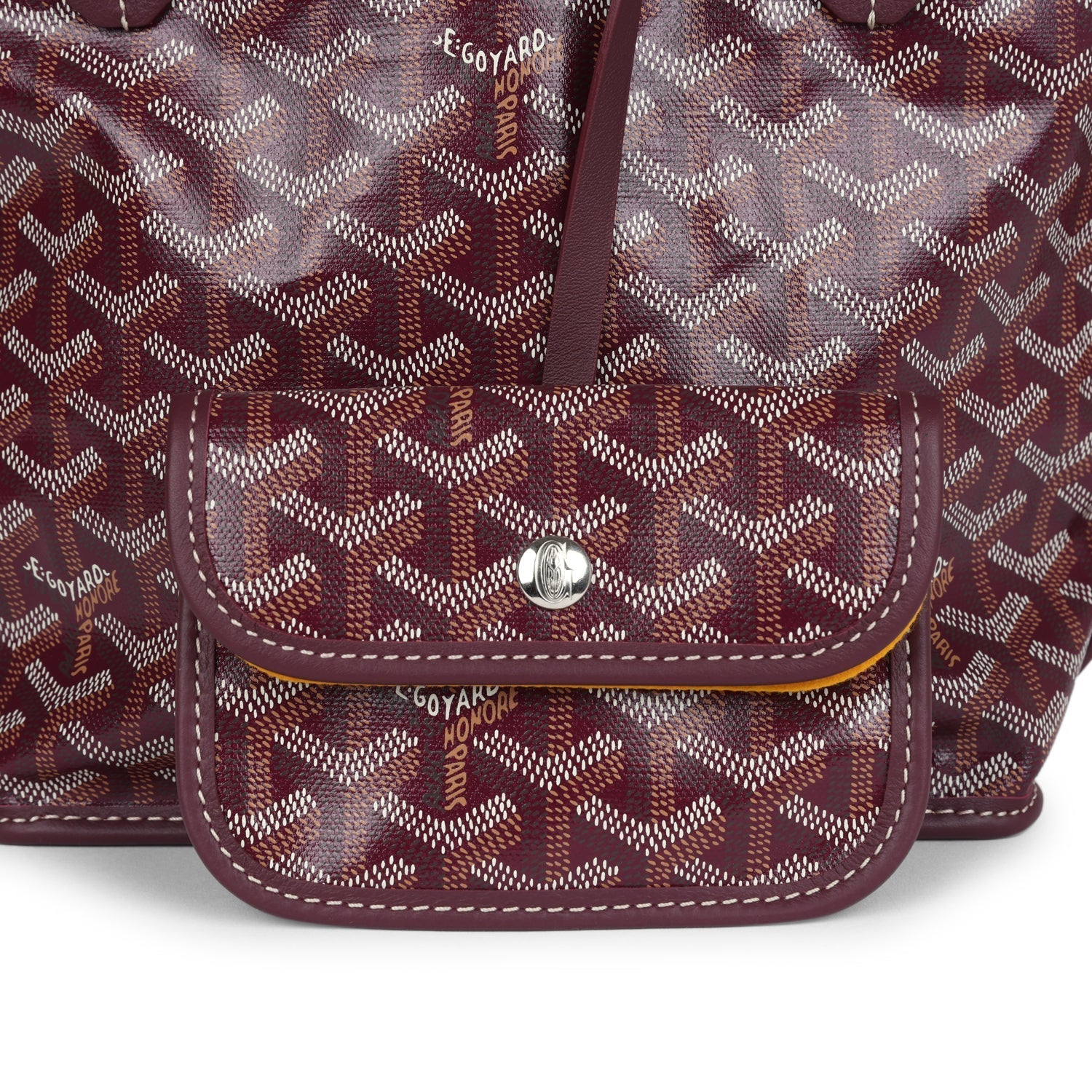 This Anjou mini reversible tote is in burgundy goyardine canvas and leather with palladium hardware and features contrast stitching, burgundy leather handles and trim, and a detachable yellow pouch.