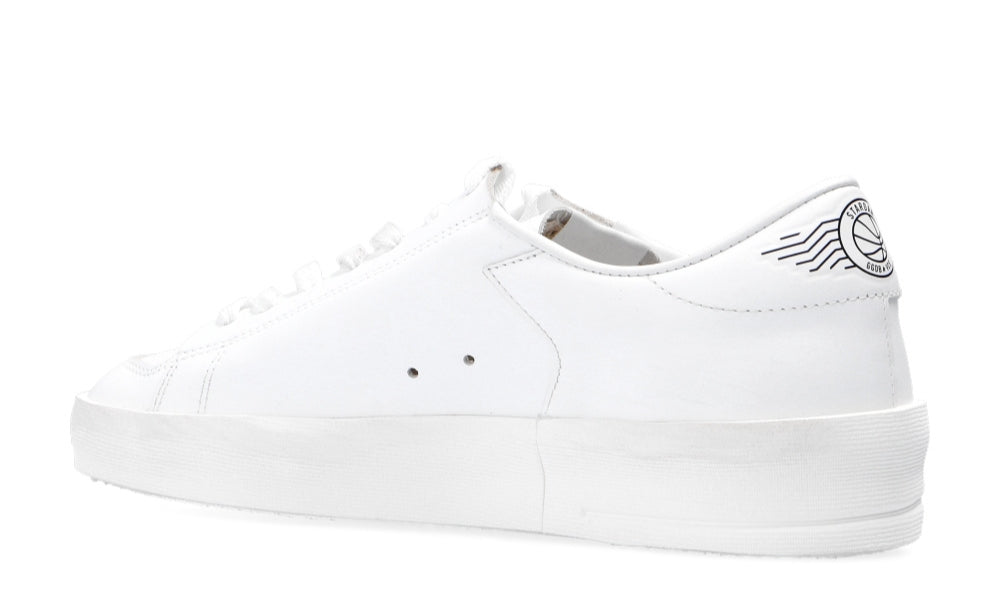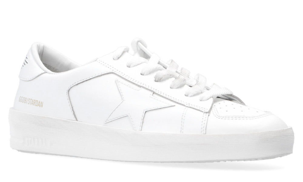 White 'Stardan' sneakers from Golden Goose. Made of leather, this lace-up pair features a tongue patch with a logo, perforations and a cream rubber sole.