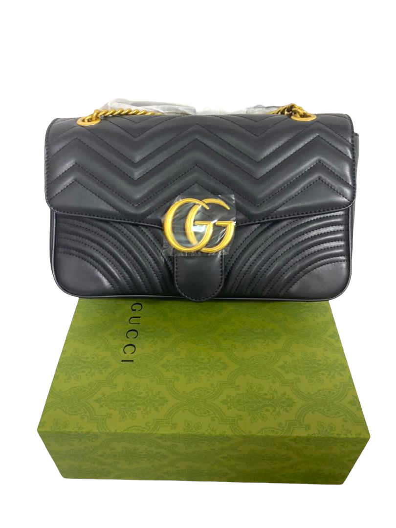 Gucci Leather bag. Model featuring a chevron motif with a heart on the back, a sliding leather and chain shoulder strap, a flap with a spring closure and an internal zip pocket. GG logo on the front.