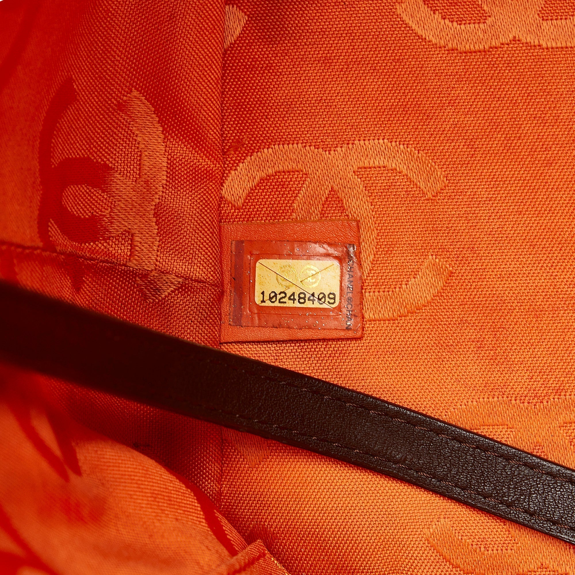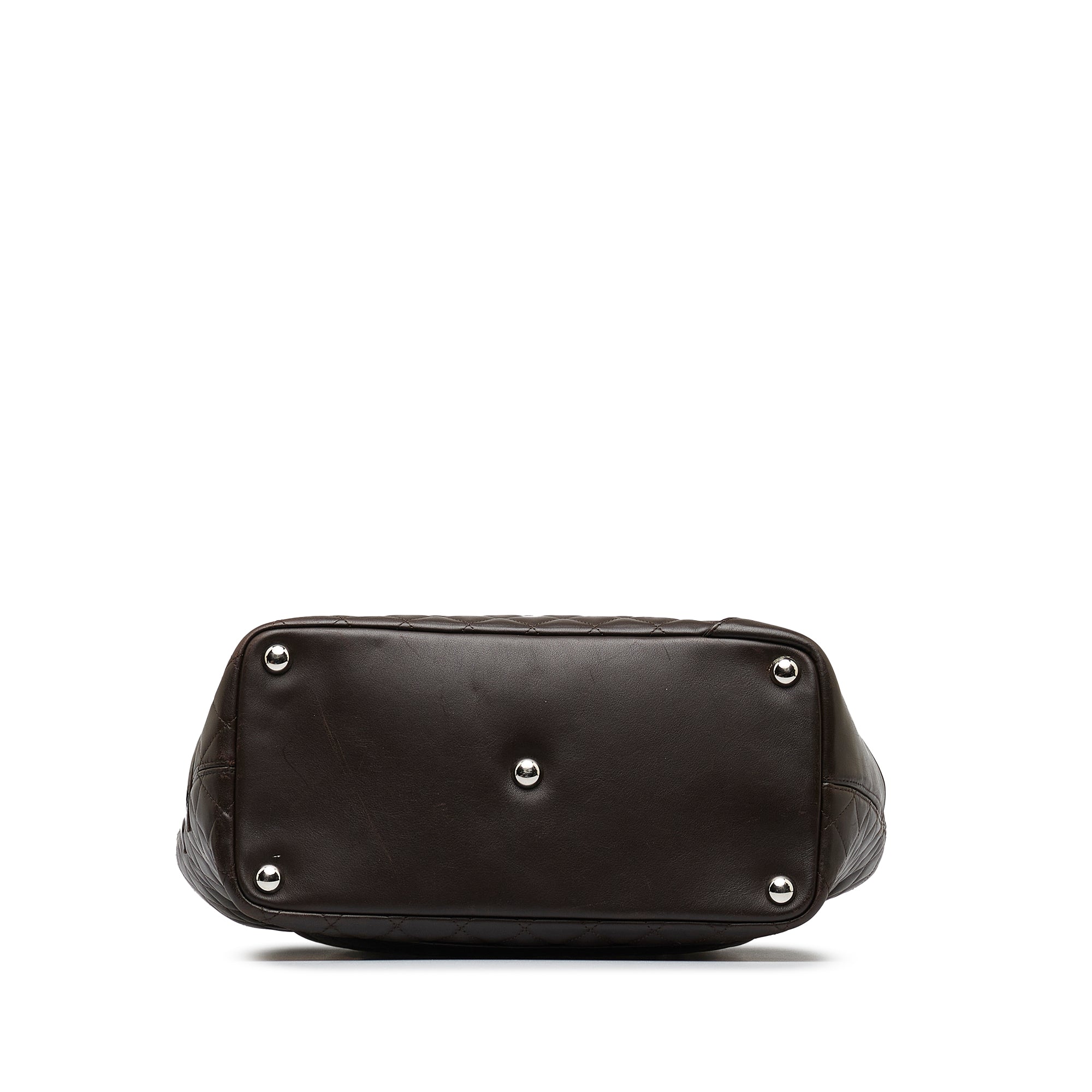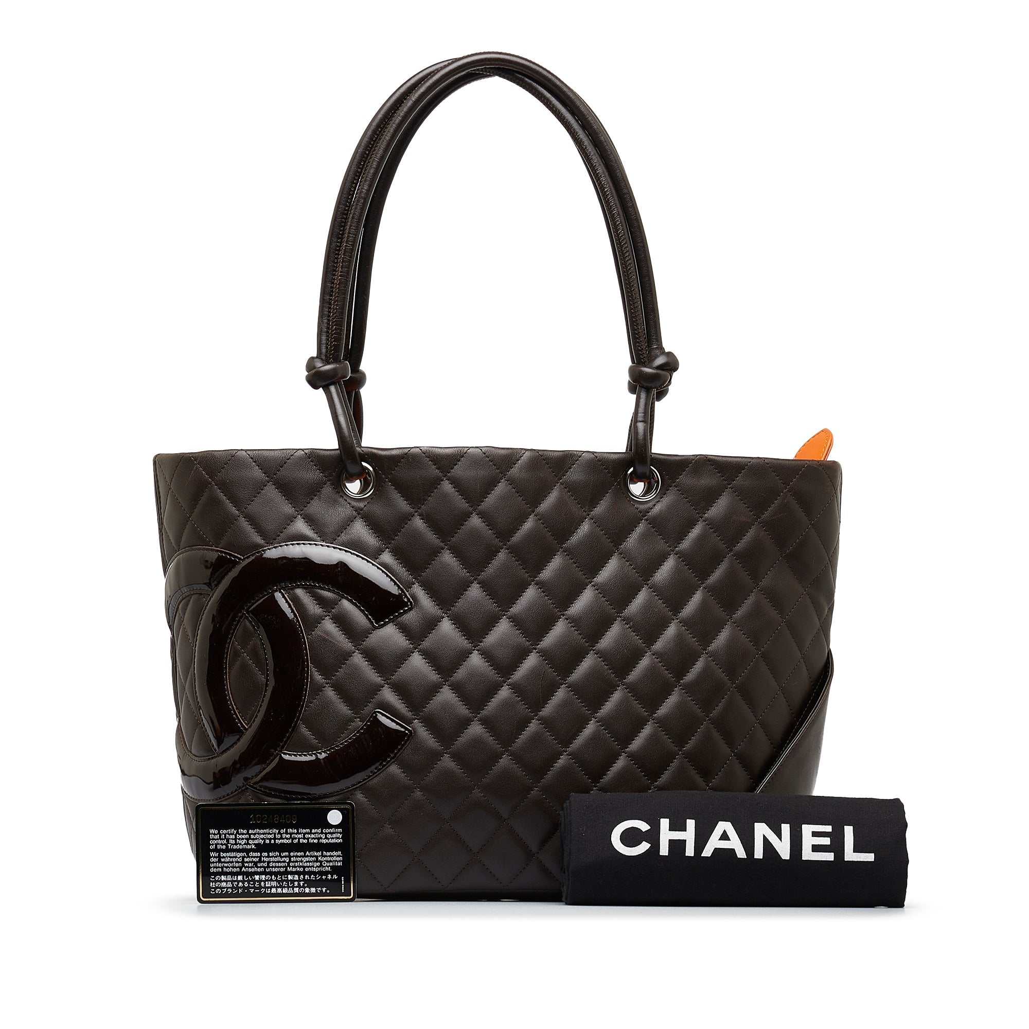 Product Details: Brown Chanel Large Cambon Ligne Tote. The Cambon Ligne tote features a quilted lambskin leather body, rolled leather handles, a top zip closure, an exterior back slip pocket, and interior zip pockets. 9.4' L x 15.4' W x 5.5' D, 8.3' drop. Serial number 10248409.