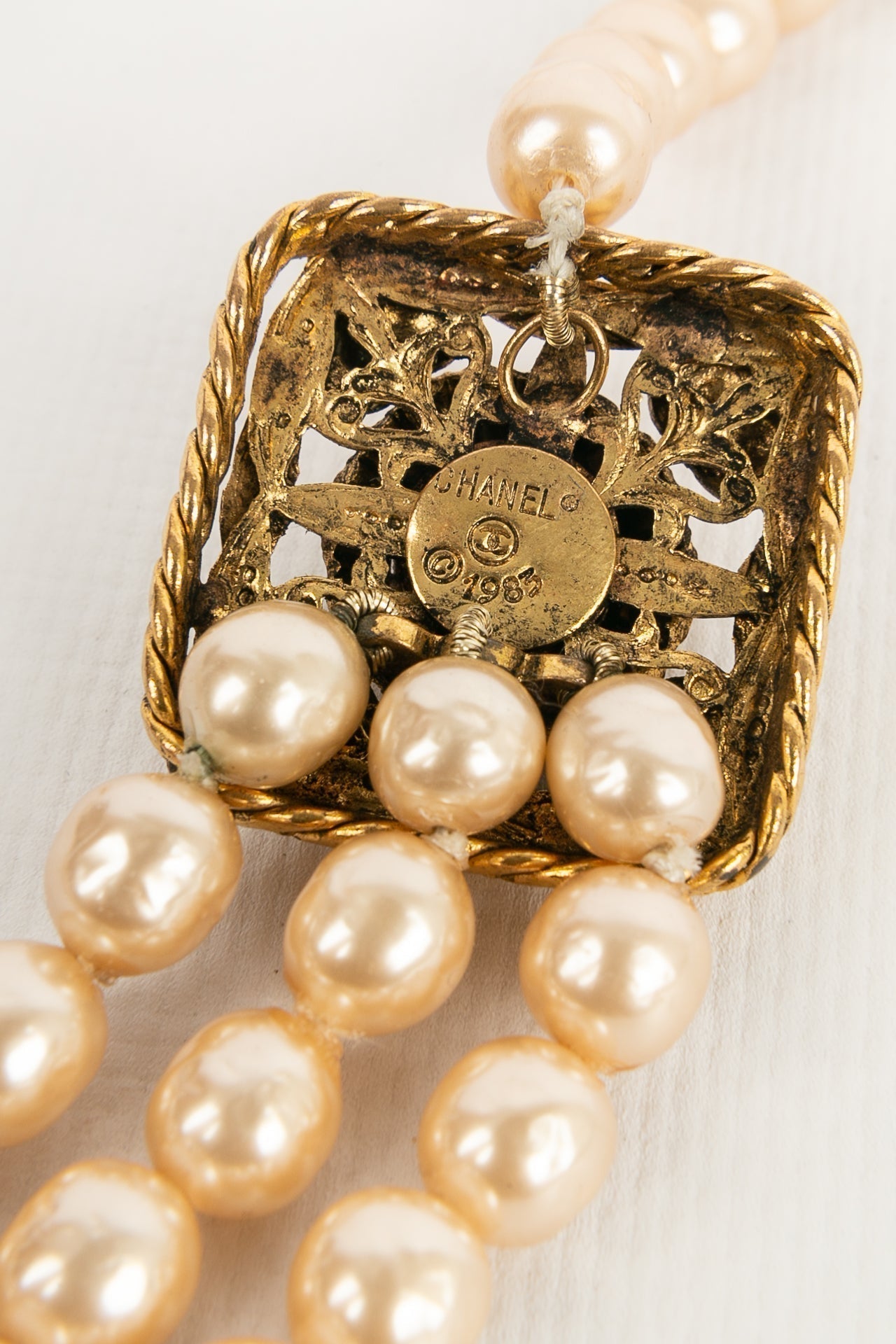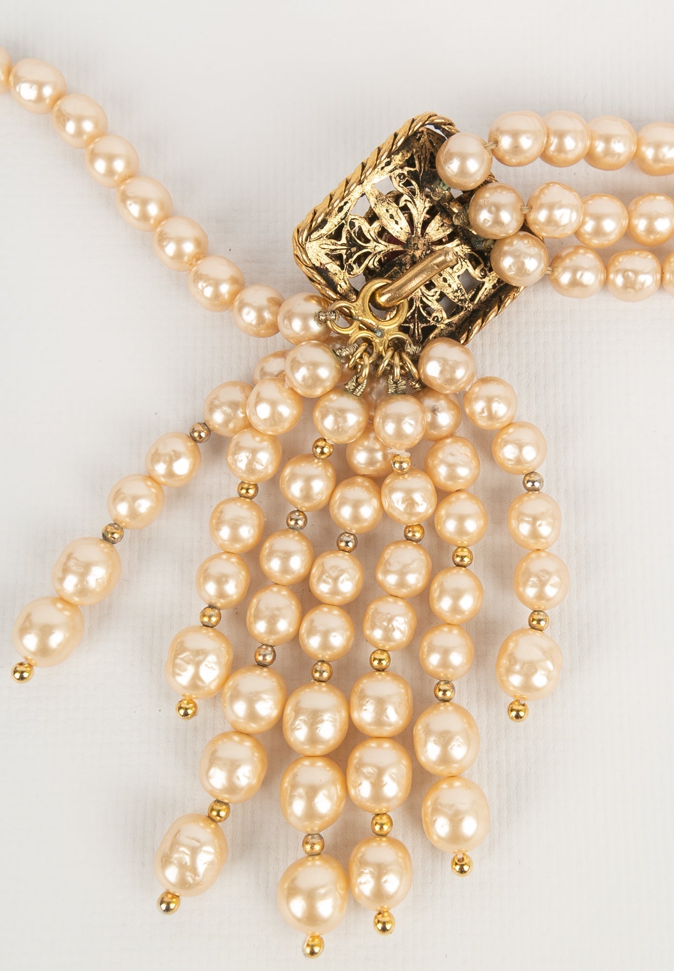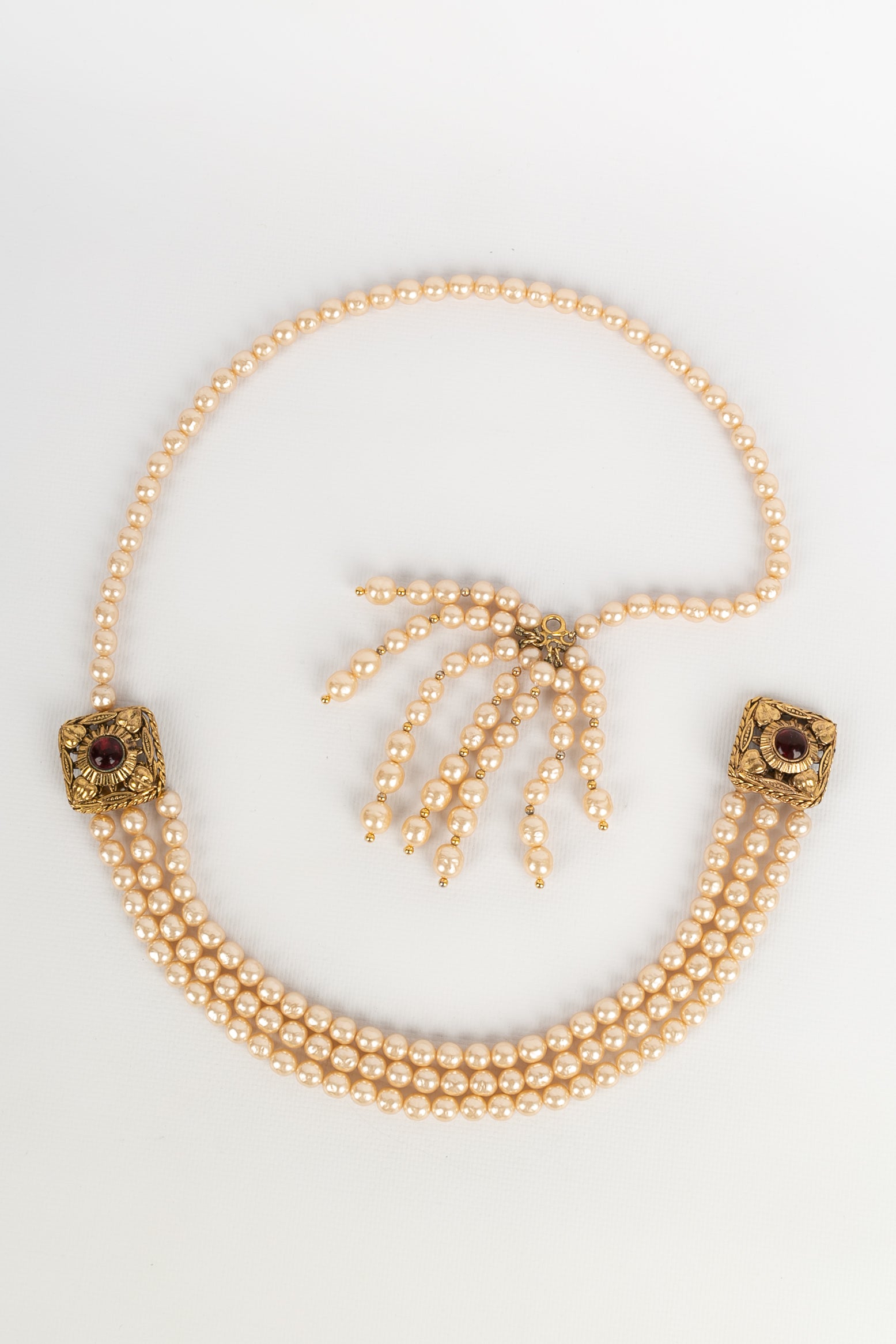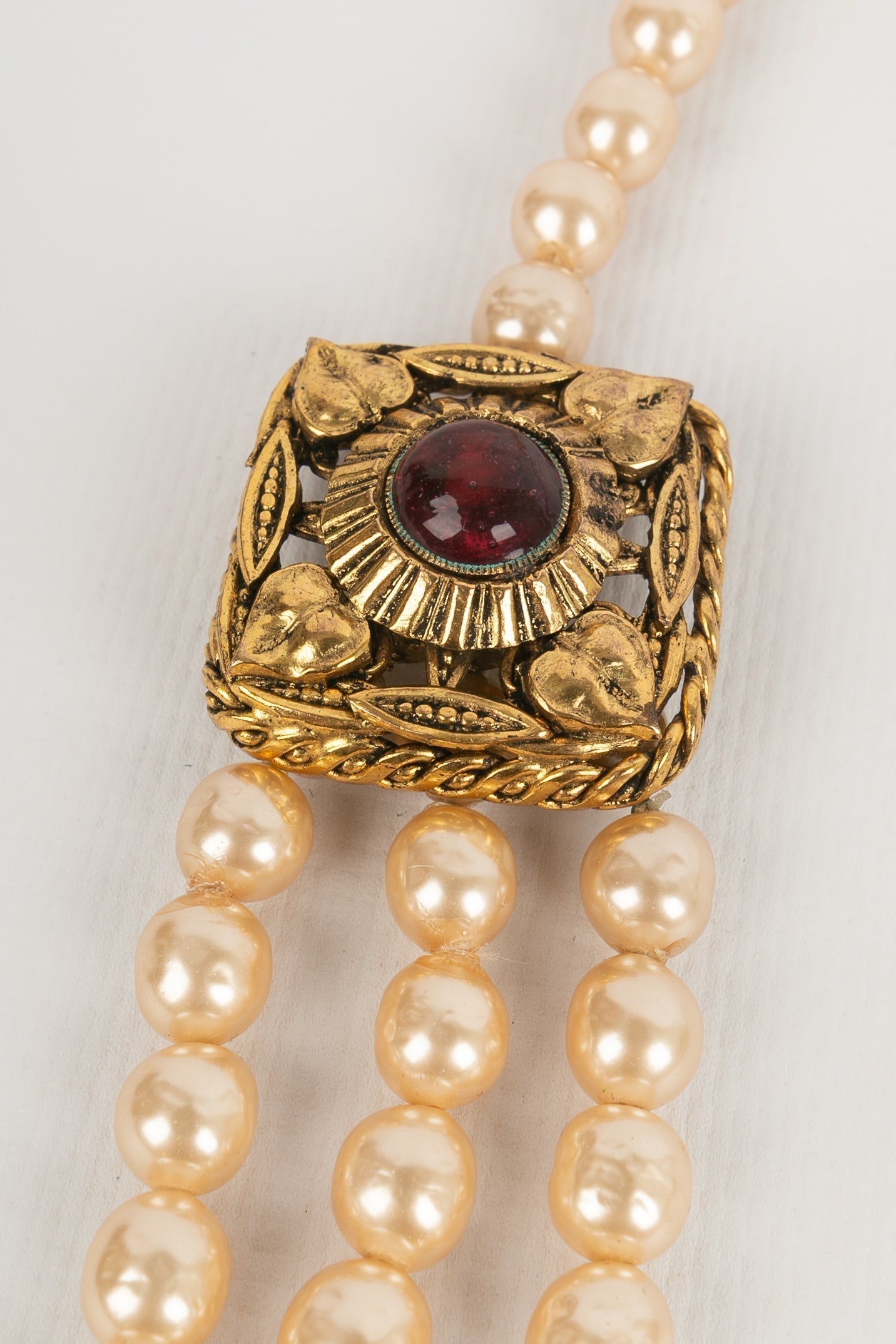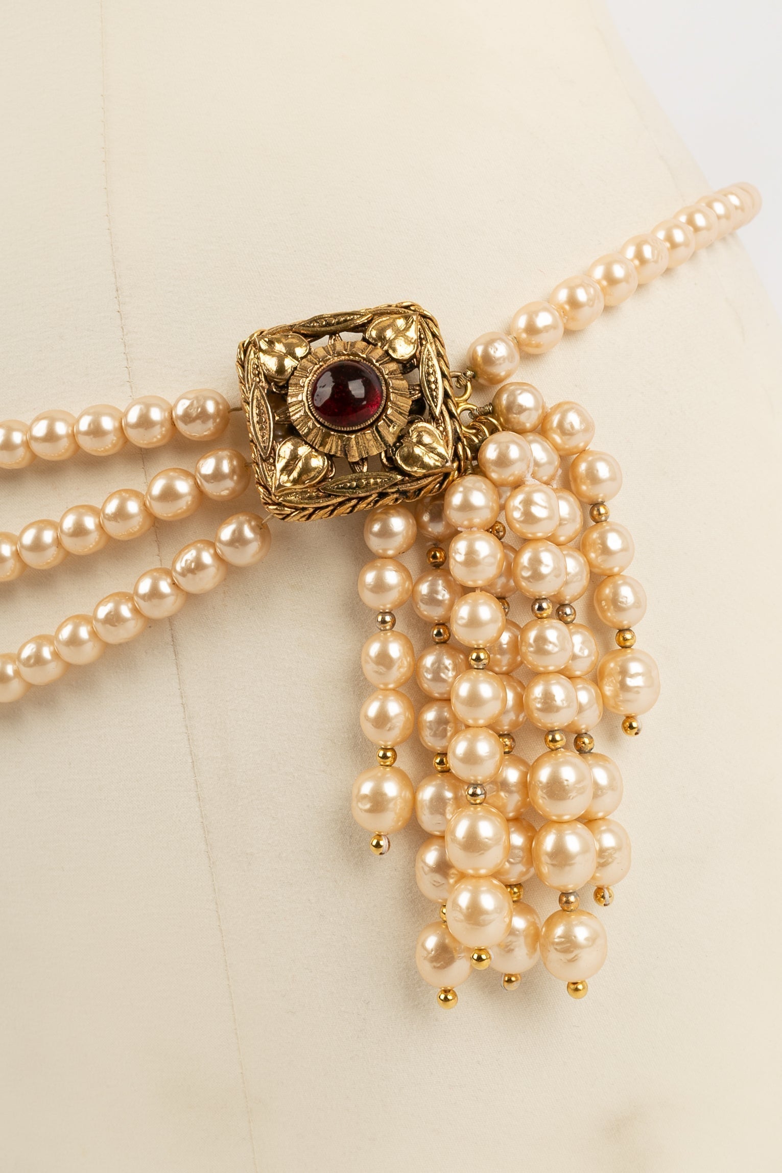 CHANEL -Ceinture de perles nacrées et métal doré pavée d'un cabochon en pâte de verre rouge. Collection 1983.