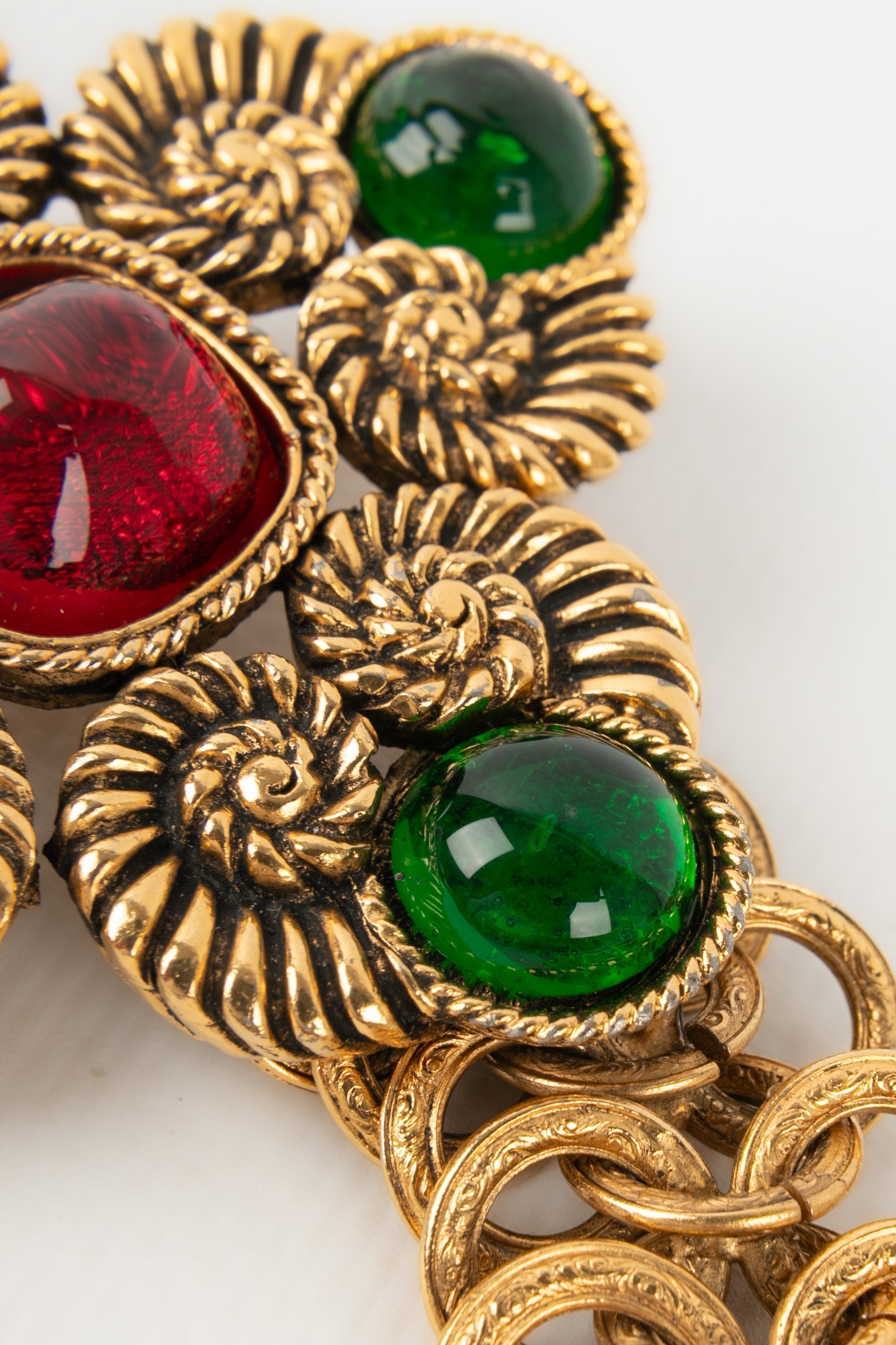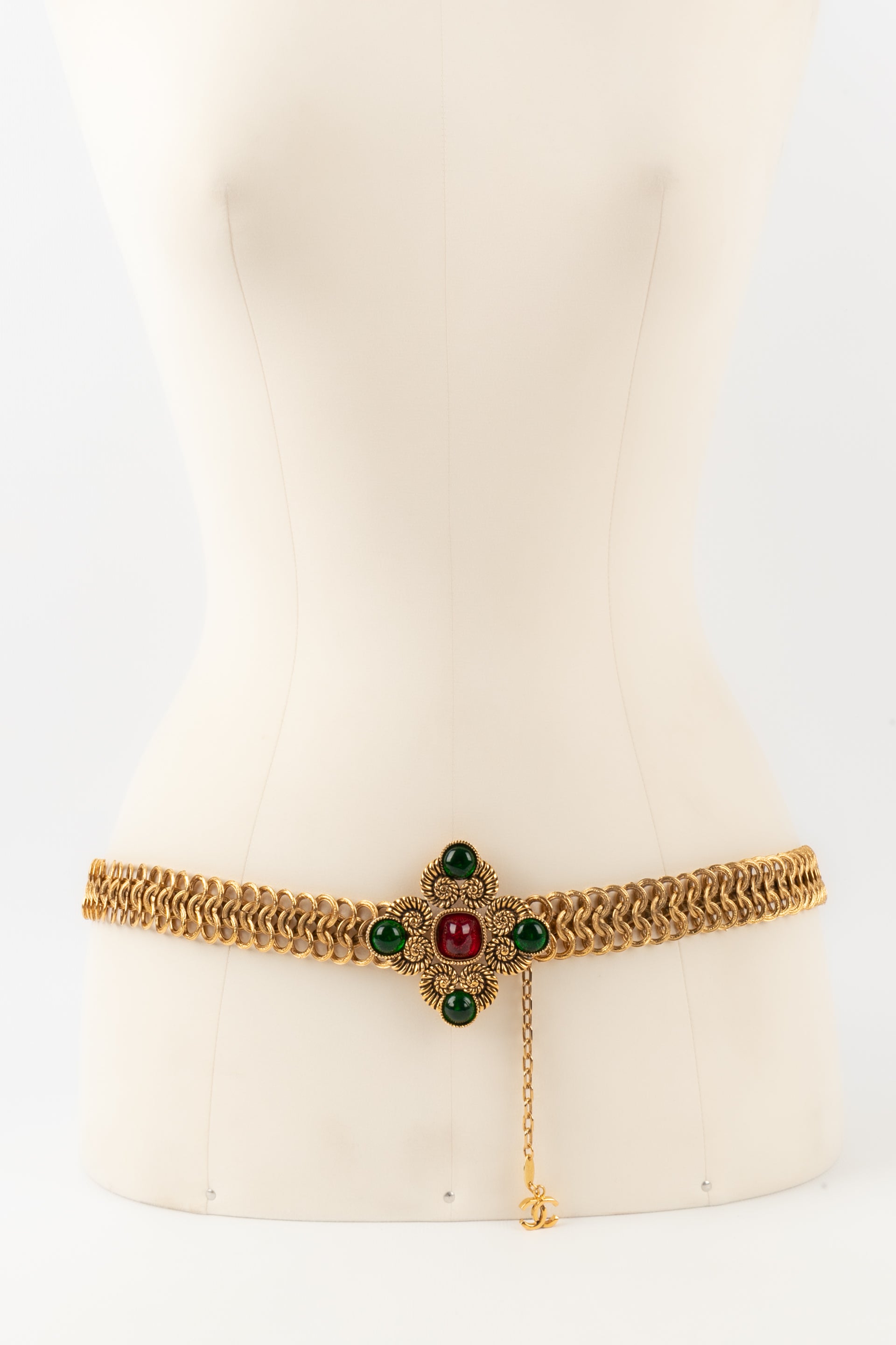 CHANEL -(Made in France) Ceinture en métal doré, pâte de verre verte et rouge. Collection 1985.
