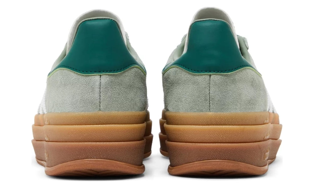 The adidas Women’s Gazelle Bold ‘Silver Green Gum’ brings a modern and elevated profile to the archival silhouette. A pastel green hue is applied to the suede midsole, accented with white serrated leather three-stripes and a leather back tab in Collegiate Green. A thin, molded tongue combines with a padded collar lined in synthetic leather for a comfortable fit. The low-top is mounted on a stacked platform midsole, built with gum rubber in a gradient finish.