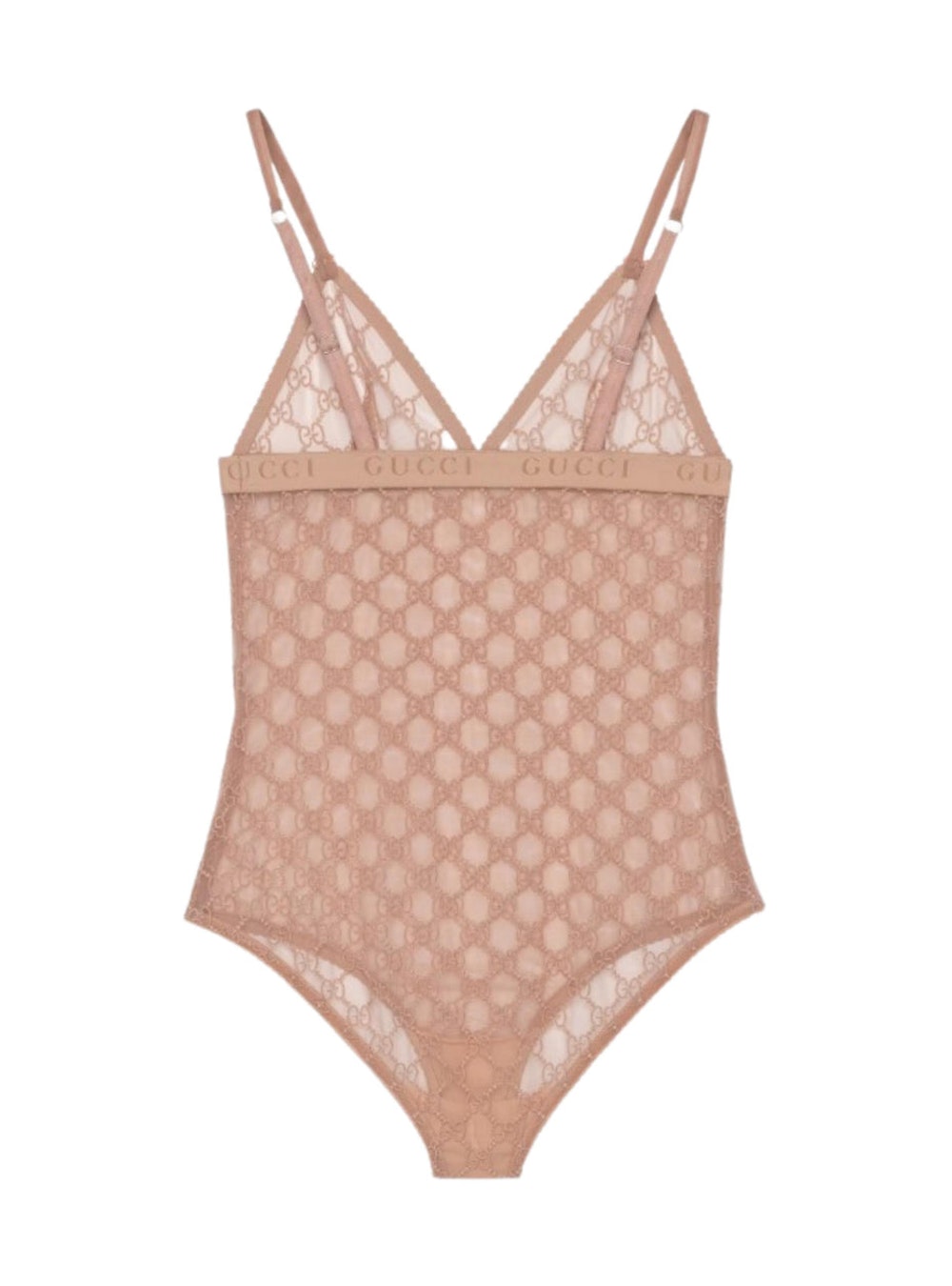 Gucci body in tulle. Features adjustable straps, elasticized logo ribbon, and all-over GG embroidery. Button closure at the bottom.