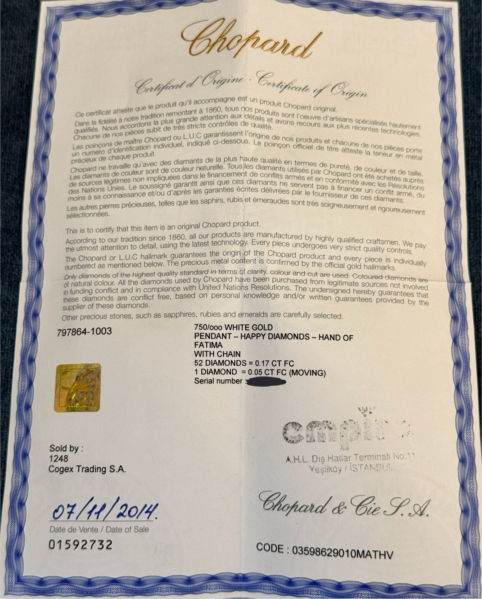 CHOPARD HAMSA FATIMA HAND LUCK HAND FULL SET LIKE NEW