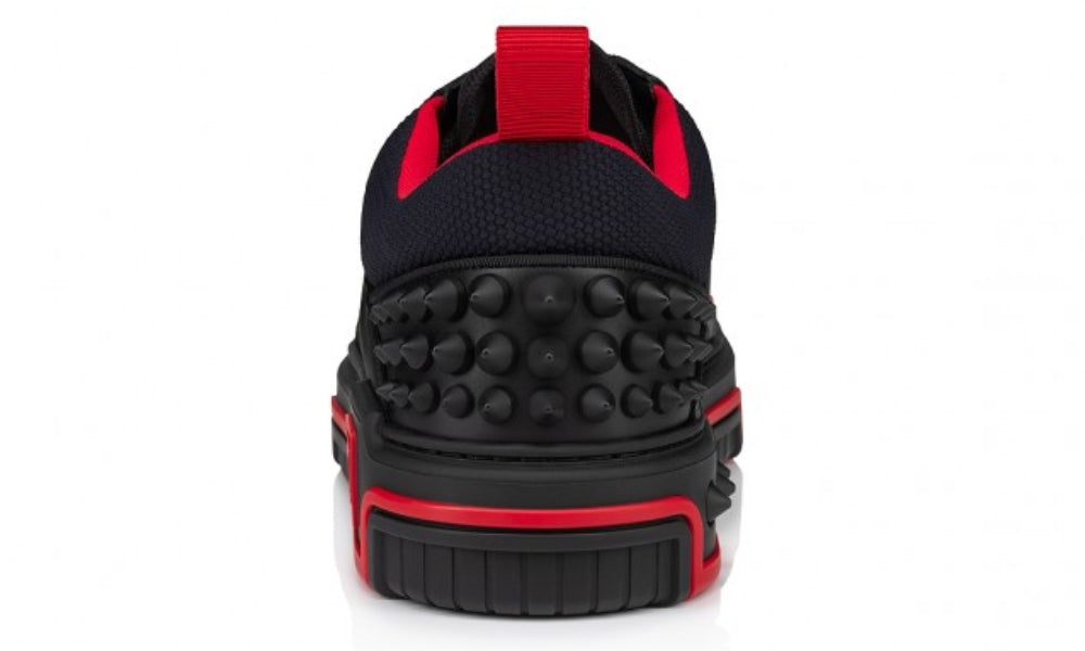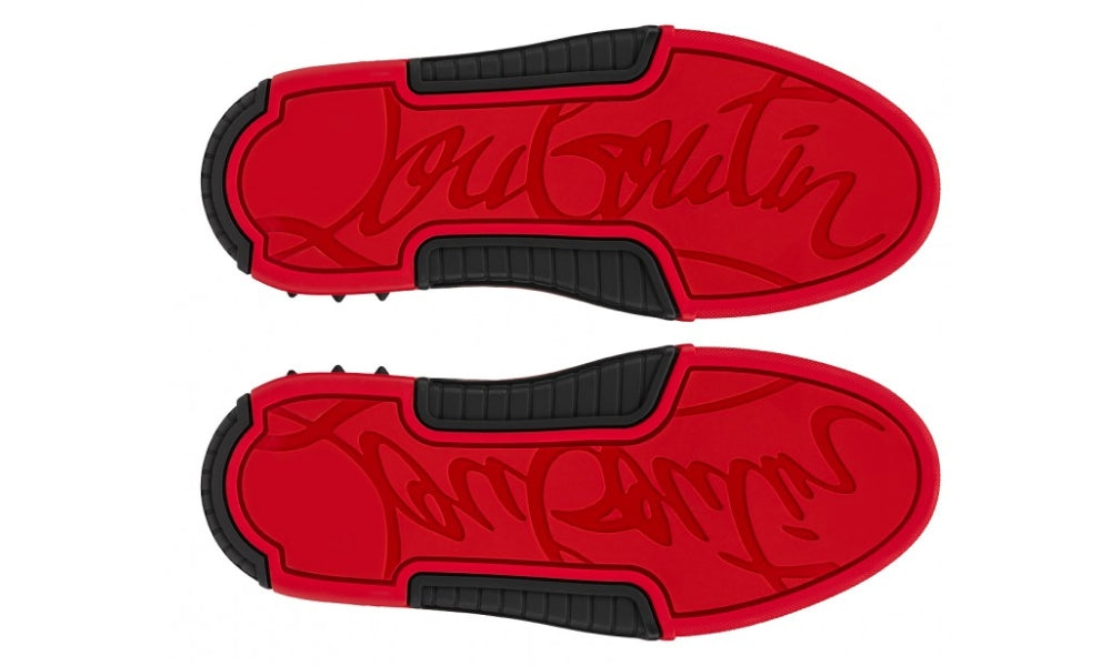 The Astroloubi is inspired by the world of basketball in the 90s. This low-top sneaker in black is crafted in calf leather and suede and patent leather. It is set on a rubber sole and has an iconic heel tab. It also features a CL varsity monogram on the side and signature Maison Christian Louboutin spikes.