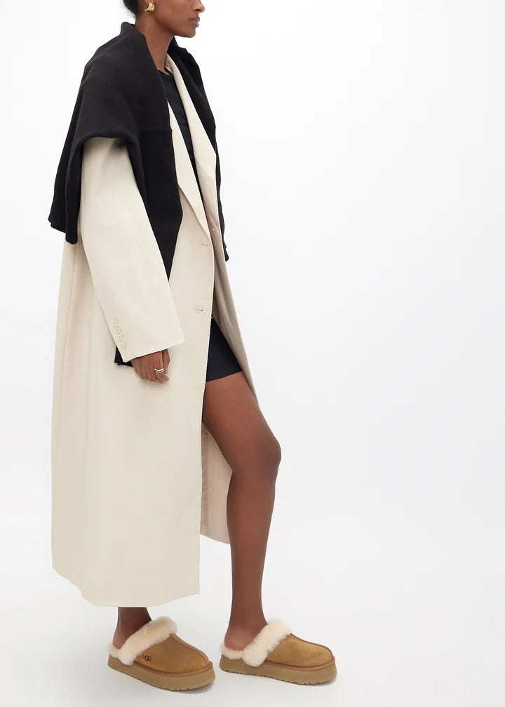 UGG unisce i modelli Coquette e Disco per creare le audaci pantofole Disquette: perfette per l'outdoor, offrono un'ammortizzazione che dura tutto il giorno e un look massimalista. Questo modello slip-on vanta una suola platform in stile retrò, tomaia in pelle scamosciata, collo e fodera in morbida pelle di pecora e il logo UGG® impresso a caldo sul lato.